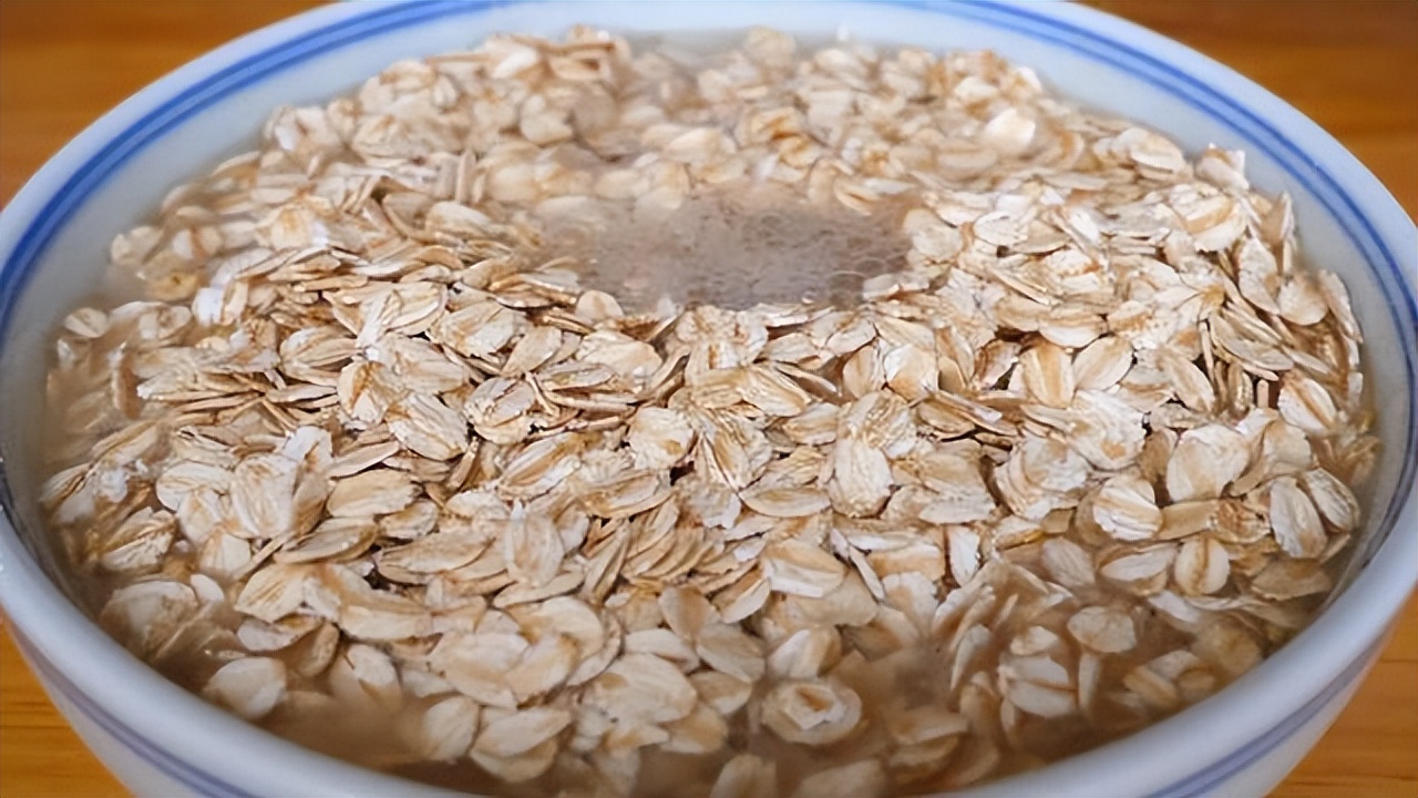100克燕麦加入清水,清洗一下洗掉表面灰尘,洗好后再用漏勺捞出来,放到大碗中,加入适量清水,浸泡10分钟。