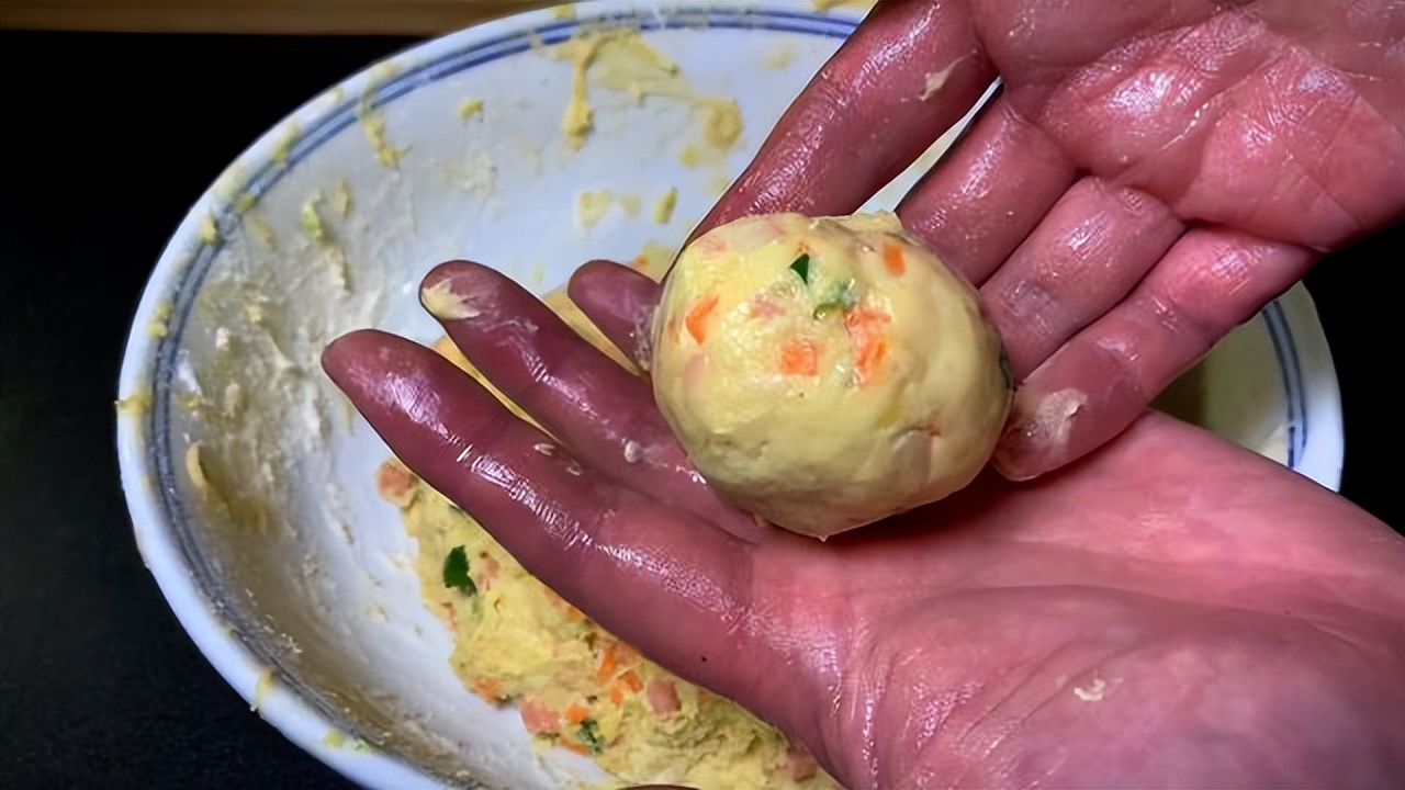 时间差不多打开保鲜膜,加入一勺干面粉揉均匀,菜板上撒一些干面粉,手上涂抹食用油,揪起一个面团放在手掌心不停的搓揉,揉成圆球。