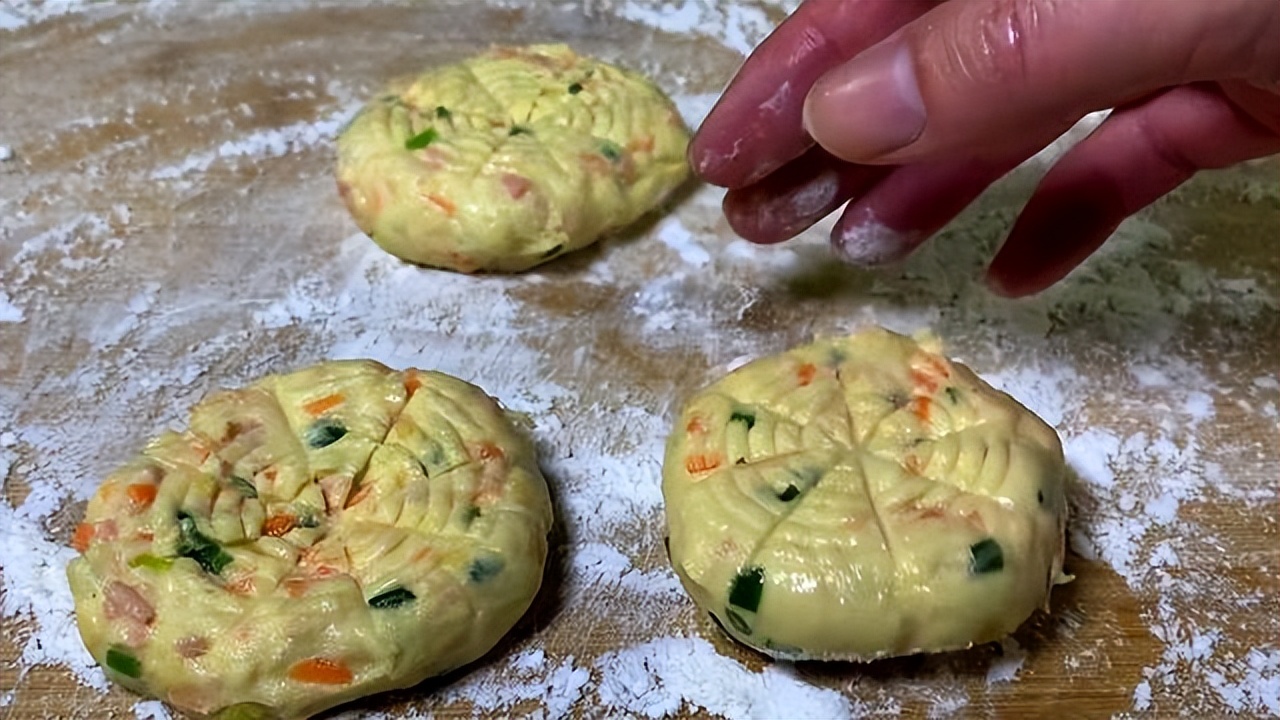 揉好后放在菜板上,压扁压成花纹。