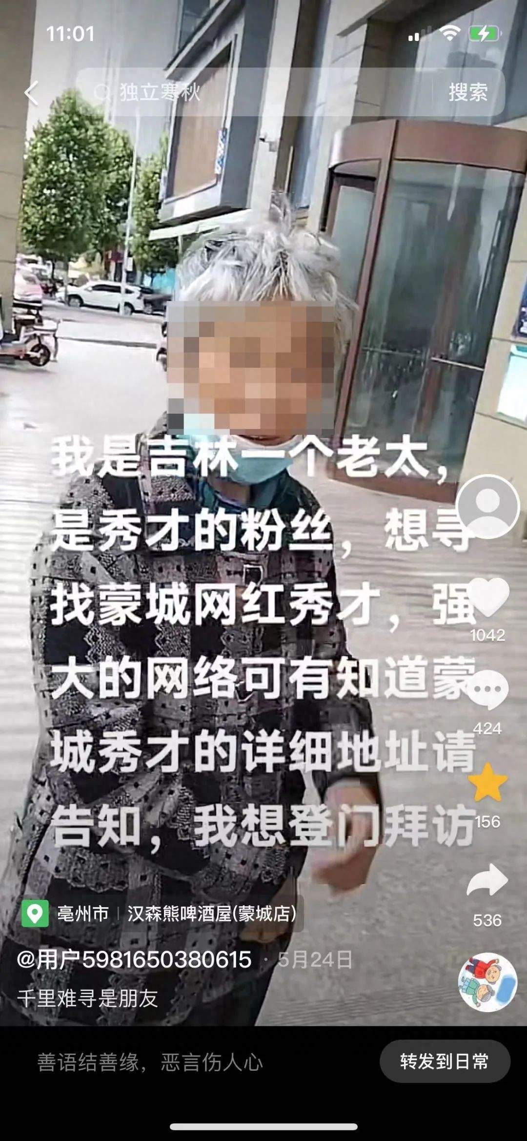 母在虎是上述视频的拍摄者。他是蒙城当地人,也是“秀才”的中学校友。他告诉澎湃新闻记者,当时有一位吉林老太太坐着出租车,让司机带她在蒙城找网红“秀才”。那时“秀才”在县城里并不出名,司机只知道另一个网红,就把老太太送去。那位网红把母在虎叫了过去,说“又来了一个老太太”。