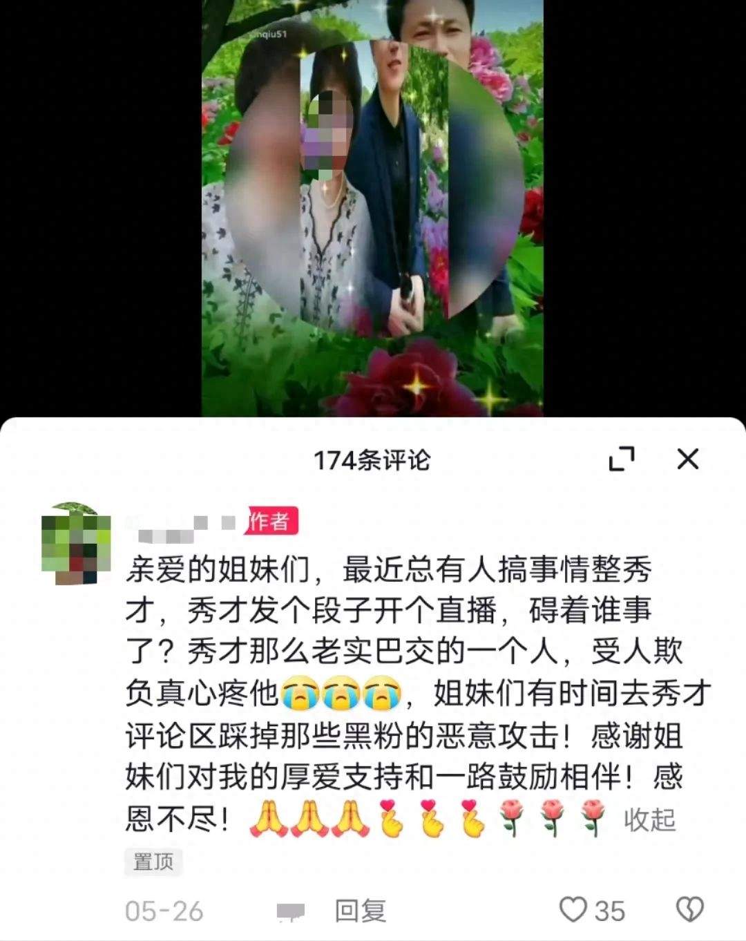 但一直到今年5月25日左右,他才变得为众人所知——有位吉林七旬老太跨越上千公里,坐火车到安徽蒙城寻找“秀才”,这个过程被短视频拍下,在平台上爆火。人们这才发现,“秀才”的评论区聚集着不少忠实的中老年女性观众,她们常在现实生活中失语,他也因此被戏称为“中老年收割机”。