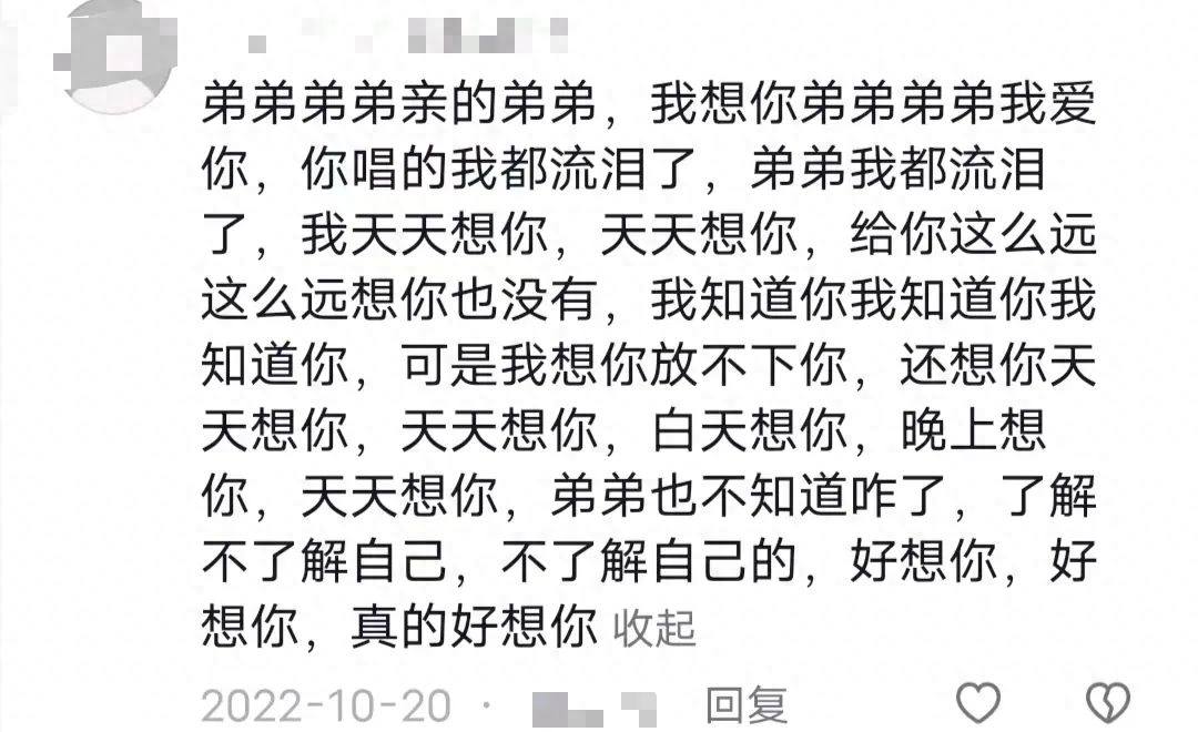 广西人繁星是少数回复私信的粉丝之一,她告诉澎湃新闻记者,她喜欢“秀才”的“善解人意”,“有时哭有时笑很现实(真实)”。但当被问及她喜欢了“秀才”多久,她很快又解释,“我喜欢他是姐弟情,没有别的意思……秀弟他唱歌太好太感人。”