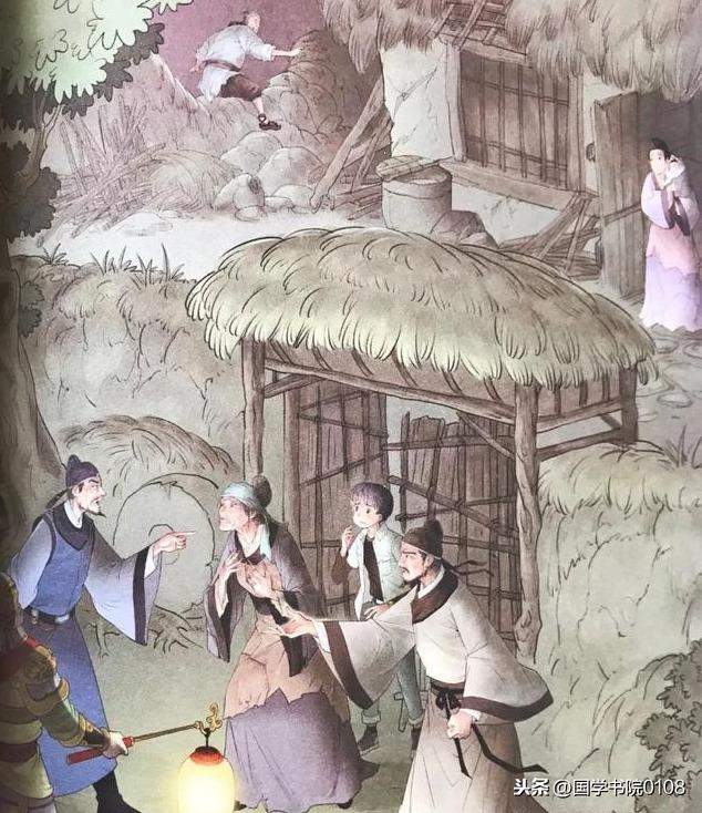 老翁翻墙逃走,老妇走出去看。