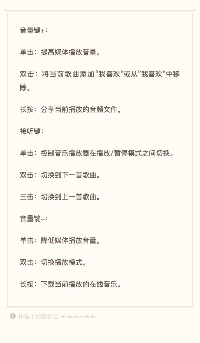 开启后,我们就可以根据系统介绍的方法实现更多操作了,比如当你在听音乐时可以通过双击“音量+”键的方式将该歌曲设置为“我喜欢”,然后再次双击则可以移除该歌曲;此外,在手机联网的状态下可以长按“音量+键”的方式分享该歌曲。更多玩法这里就不一一赘述了,感兴趣的花粉可以看看下图所示的方法进行操作: