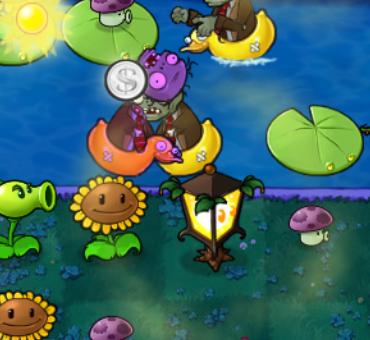 魅惑菇也是一个不错的防卫植物,前头僵尸遇见魅惑菇吃一口就会成为僵尸群体的背叛者,掉头就干同伴。看这两个僵尸互相伤害,真是死的太悲哀了!