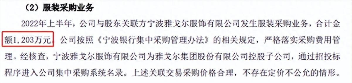 在2022年半年报中,宁波银行还披露,报告期内与股东关联方宁波雅戈尔服饰有限公司发生服装采购业务,合计金额1203万元。其按照《宁波银行集中采购管理办法》的相关规定,严格落实采购费用管理。宁波雅戈尔服饰有限公司为雅戈尔控股子公司,通过招投标程序进入集中采购系统名录。