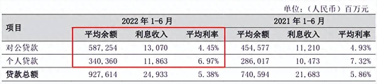 需要指出的是,同期宁波银行对公贷款金额为5872.54亿元,利息收入为130.70亿元,平均利率为4.45%;个人贷款金额为3403.60亿元,利息收入为118.63亿元,平均利率为6.97%。经计算,2022年宁波银行对公贷款的利息收入占发放贷款额的比例为2.2256%,对个人贷款的利息收入占发放贷款额的比例为3.4854%。
