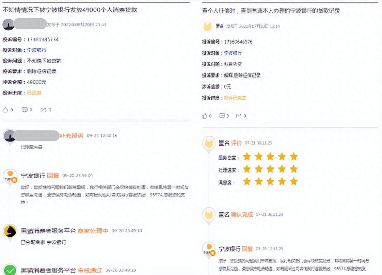 与之对应的是,据网络投诉信息,关于宁波银行的投诉中,多起投诉提及在当事人并不知情的情况下,宁波银行以当事人名义发放了消费贷款,造成的结果是当事人被录入征信不良记录。