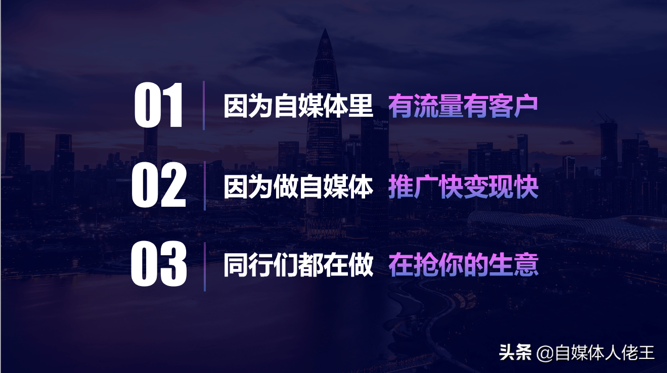 很简单啊,在互联网时代什么最重要?当然是流量,流量是一切生意的本质,流量就是客户,流量=钱。我们做企业的核心就是赚钱,有了钱,一个企业才能继续发展,继续壮大。企业无论产品或服务门槛多低多简单,只要没有流量就是没有客户,没有客户就是没有钱进来,那这个企业还能活多久。自媒体里有流量,流量就是客户,最关键的是大家都在做,你不做,就是在流失客户,流失钱。
