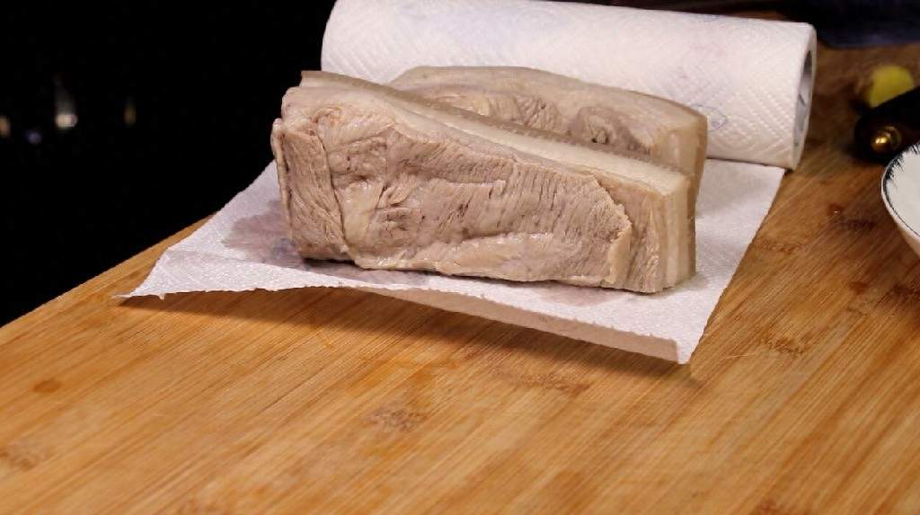 4、把猪肉捞出来放入凉水中,将猪肉表面的水分吸一下,将猪肉切成大块