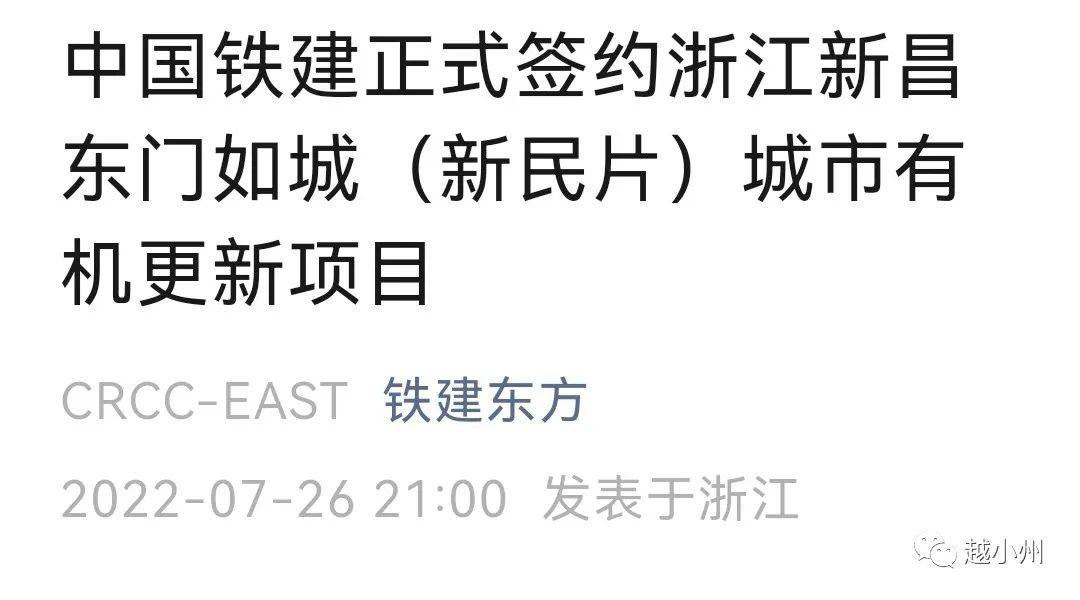 2022年6月30日,中铁建城市开发有限公司协同中铁十一局集团有限公司(牵头方)、中铁建华东建设发展有限公司、中铁上海设计院集团有限公司、中铁建投资基金管理有限公司中标新昌县东门如城(新民片)城市有机更新项目,总投资额约74.77亿元。