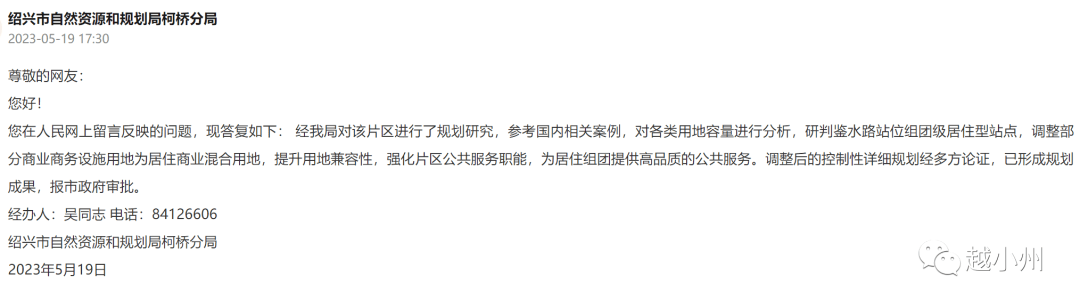 绍兴市自然资源和规划局柯桥分局答复:经我局对该片区进行了规划研究,参考国内相关案例,对各类用地容量进行分析,研判鉴水路站位组团级居住型站点,调整部分商业商务设施用地为居住商业混合用地,提升用地兼容性,强化片区公共服务职能,为居住组团提供高品质的公共服务。调整后的控制性详细规划经多方论证,已形成规划成果,报市政府审批。