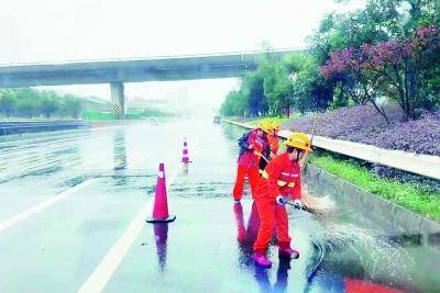 公路养护人员在绕城公路沿线清理路面积水。 南京日报/紫金山新闻记者 徐琦 通讯员 孙逸飞 摄