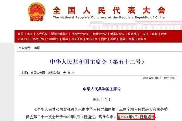 4、《中华人民共和国契税法》已由中华人民共和国第十三届全国人民代表大会常务委员会第二十一次会议于2020年8月11日通过,2021年契税最新规定自2021年9月1日起施行,届时97年实施的《中华人民共和国契税暂行条例》将会退出历史舞台;