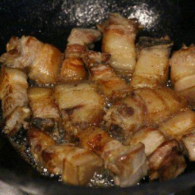 6、将切块的五花肉煎至表皮金黄。