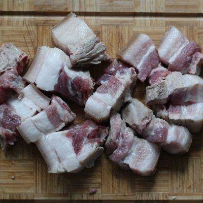 5、汆好水的五花肉取出,切块。