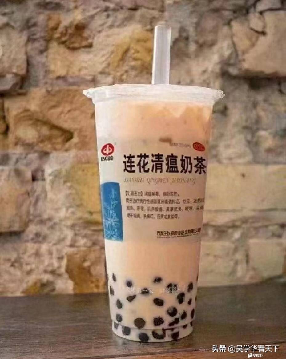 你喝完莲花清瘟洋酒,抽着莲花清瘟牌香烟,走在街上的时候,要是渴了该怎么办呢?没事,来一杯莲花清瘟奶茶,内含多种海克斯黑科技,绝对符合您麻木的舌头,Q弹的黑珍珠,绝对能够滑进您喝水都很疼的喉咙,直达您的胃里。