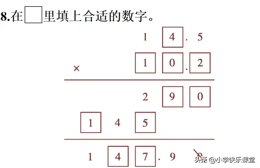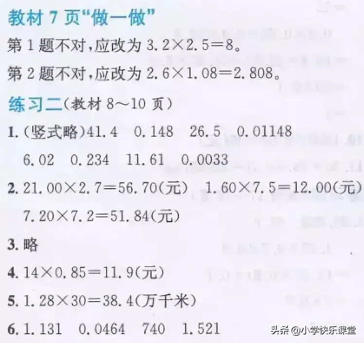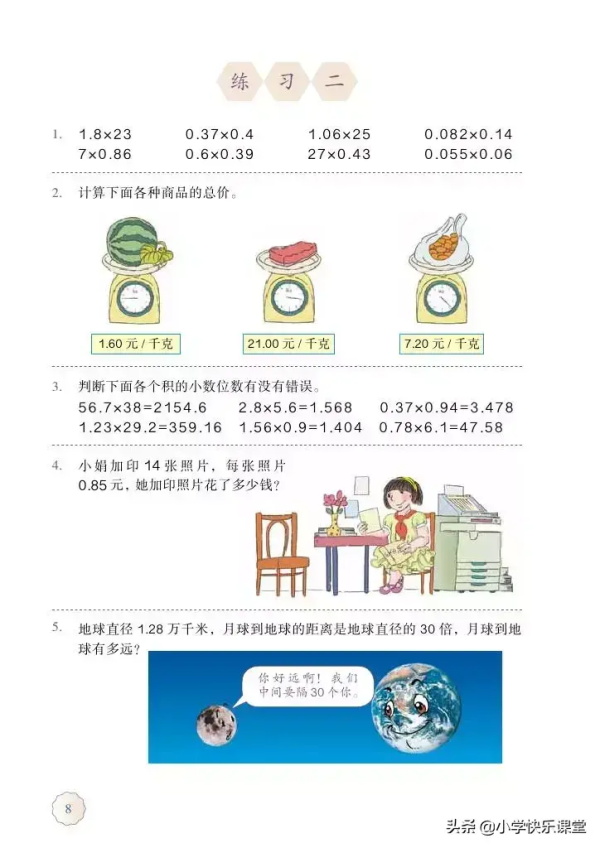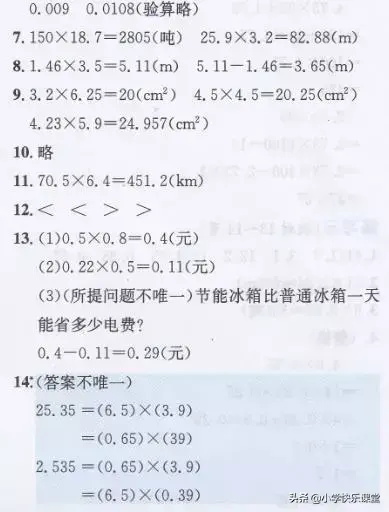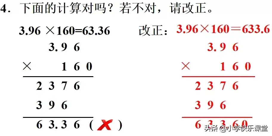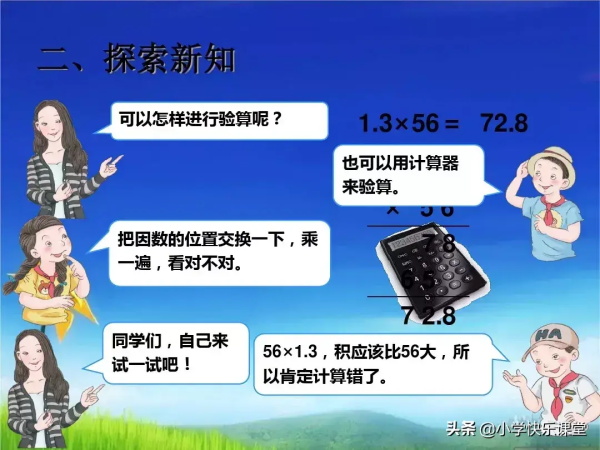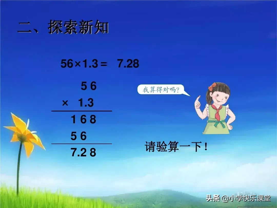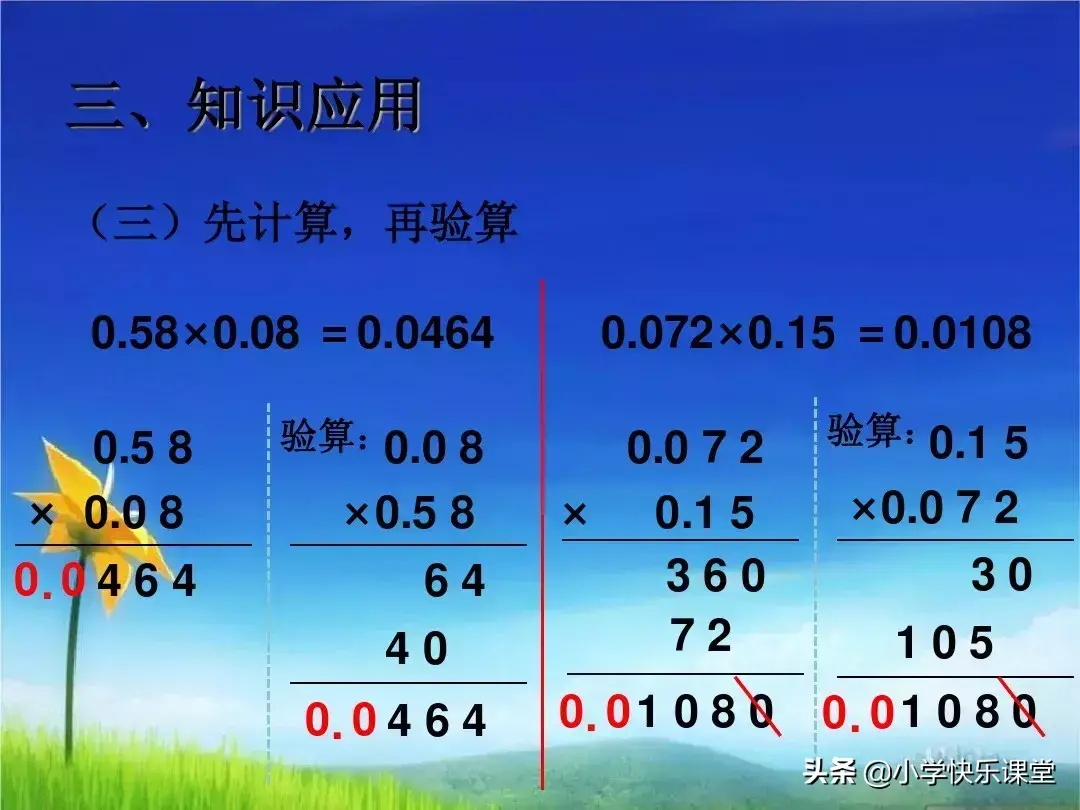 (2)小数乘法的验算方法:可以把因数位置交换位置相乘,也可以用估算、用计算器来验算。