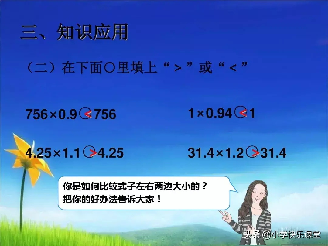 (1)一个数(0除外)乘大于1的数,积比原来的数大。一个数(0除外)乘小于1的数,积比原来的数小。