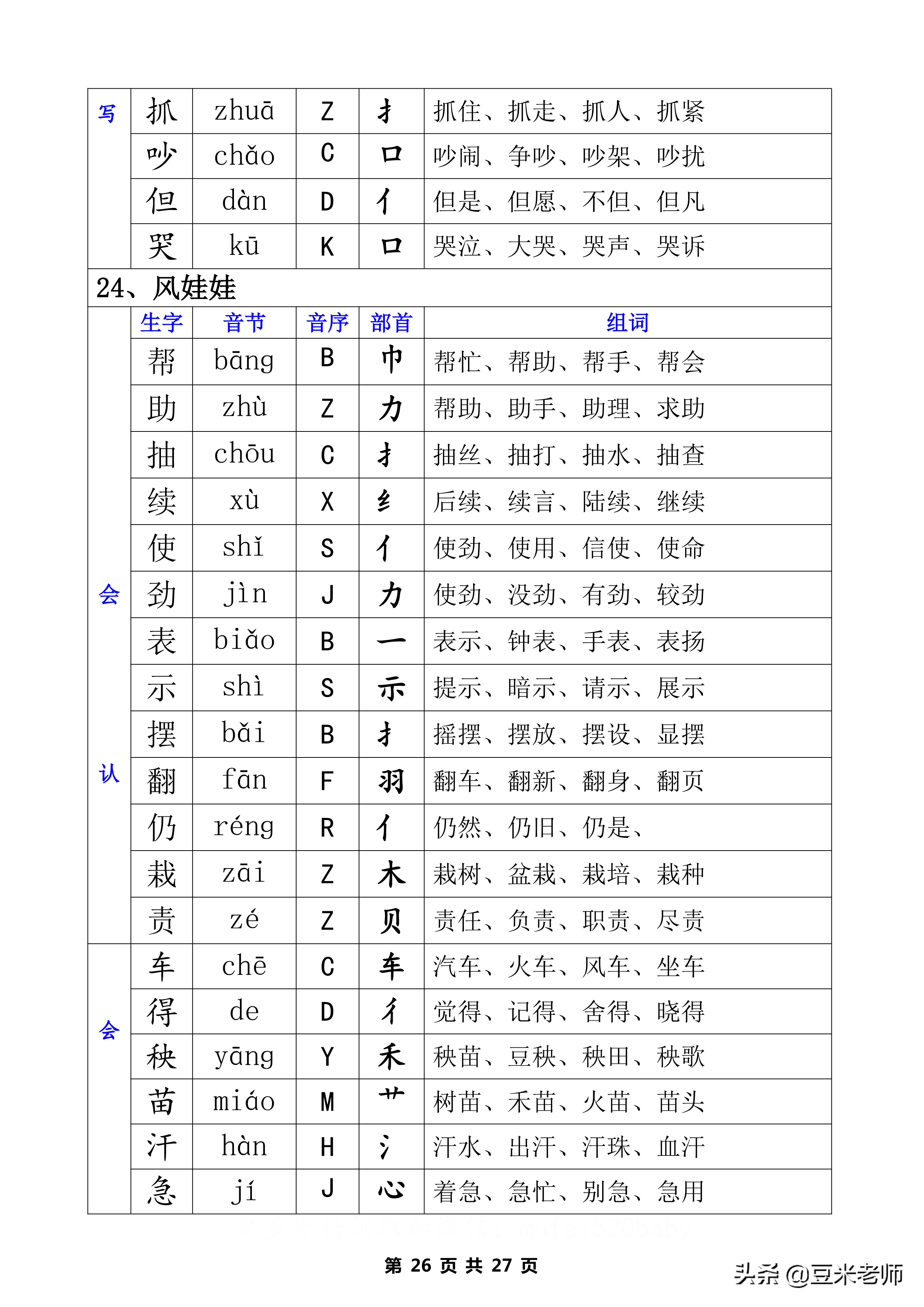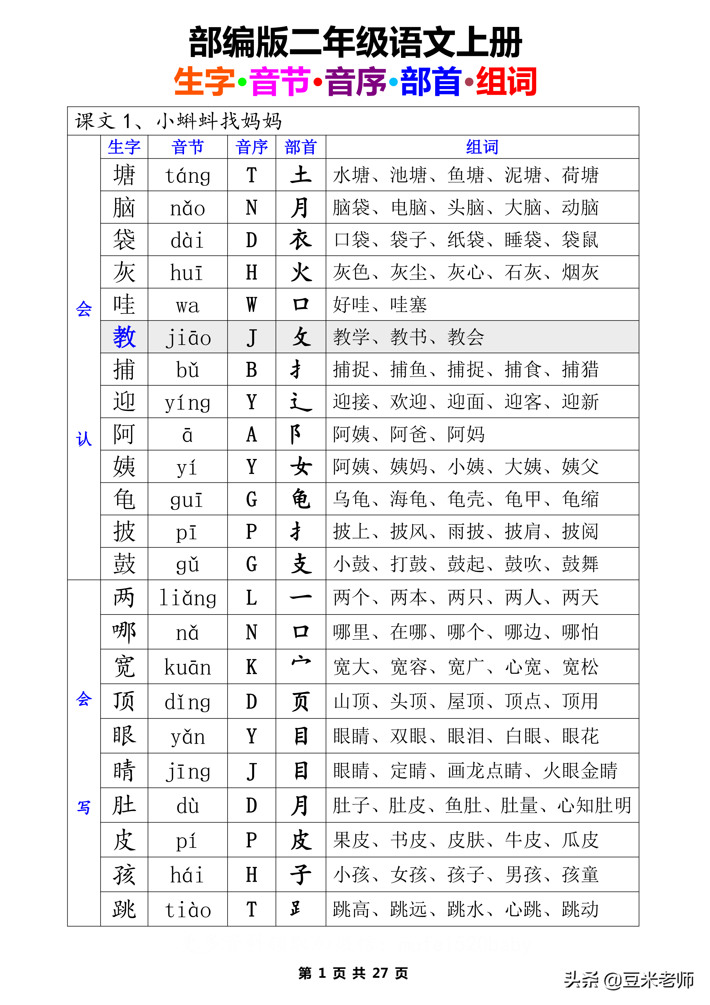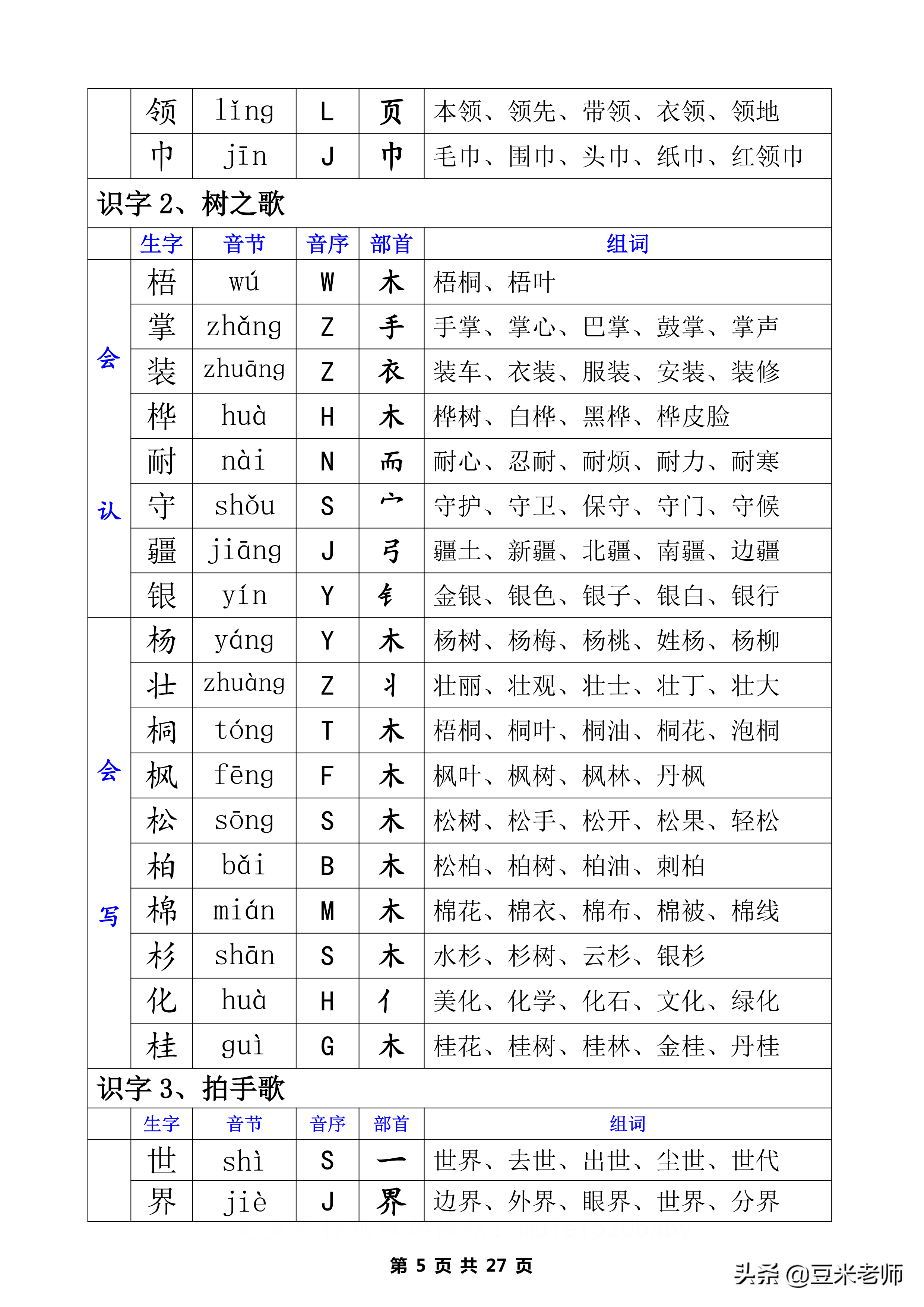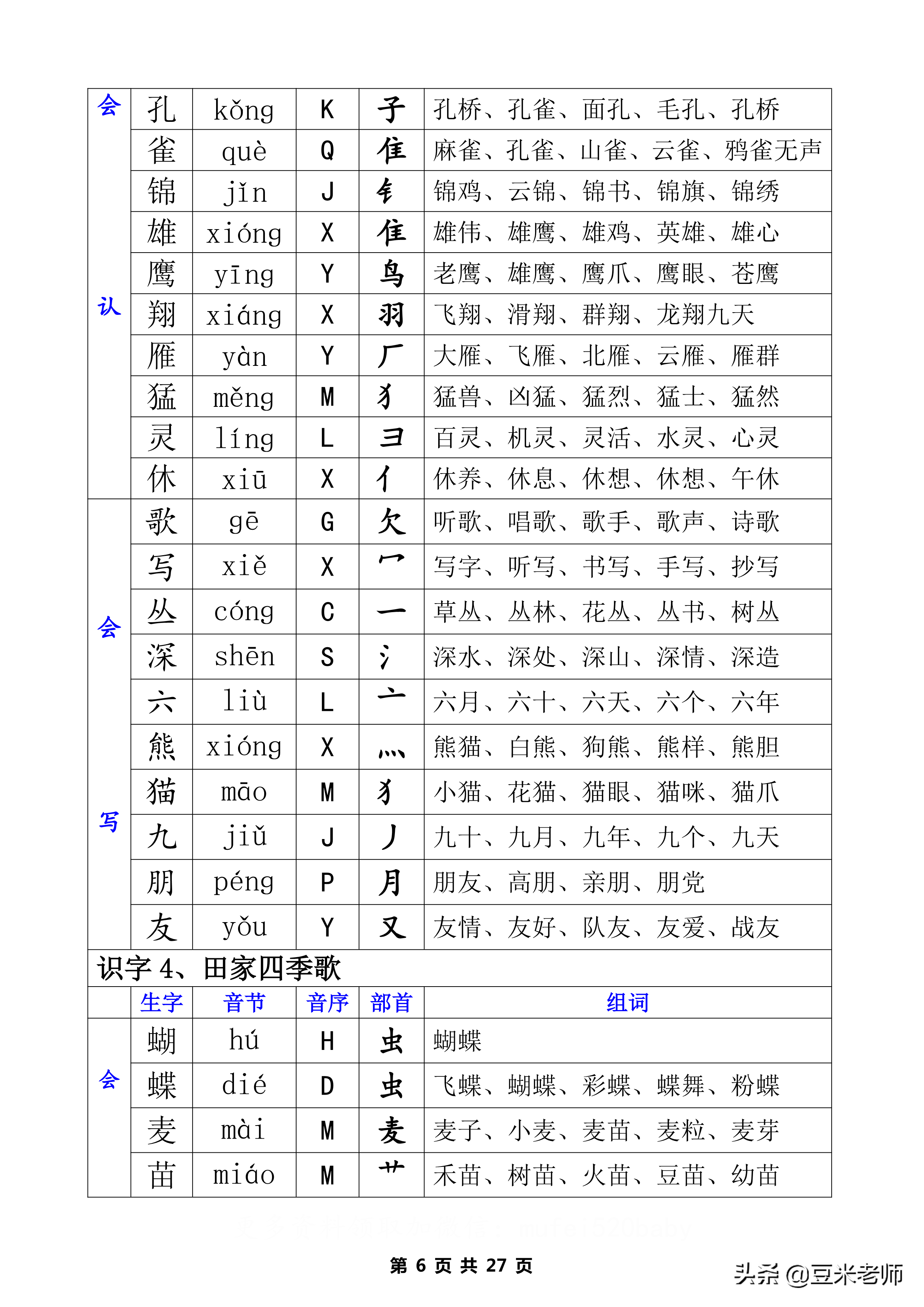 不过,小编在网上搜集了一份去年的生字总结表,包含一类生字和二类生字的音节、音序、部首和组词,也是非常不错的一份资料,可以分享给大家,以供参考。
