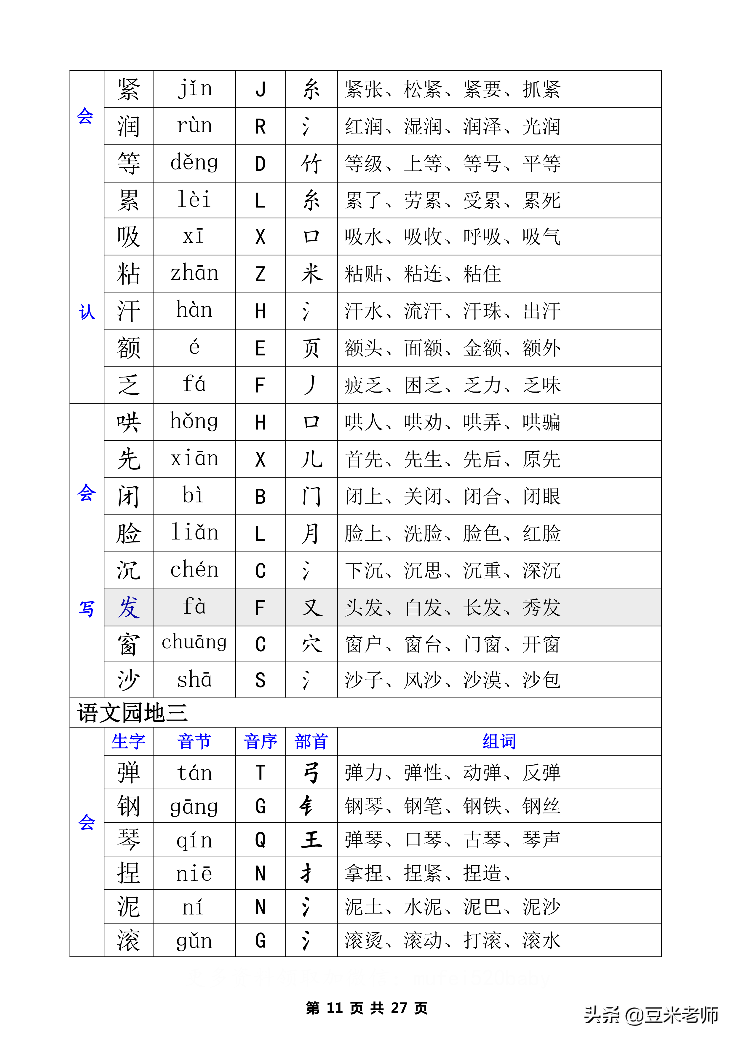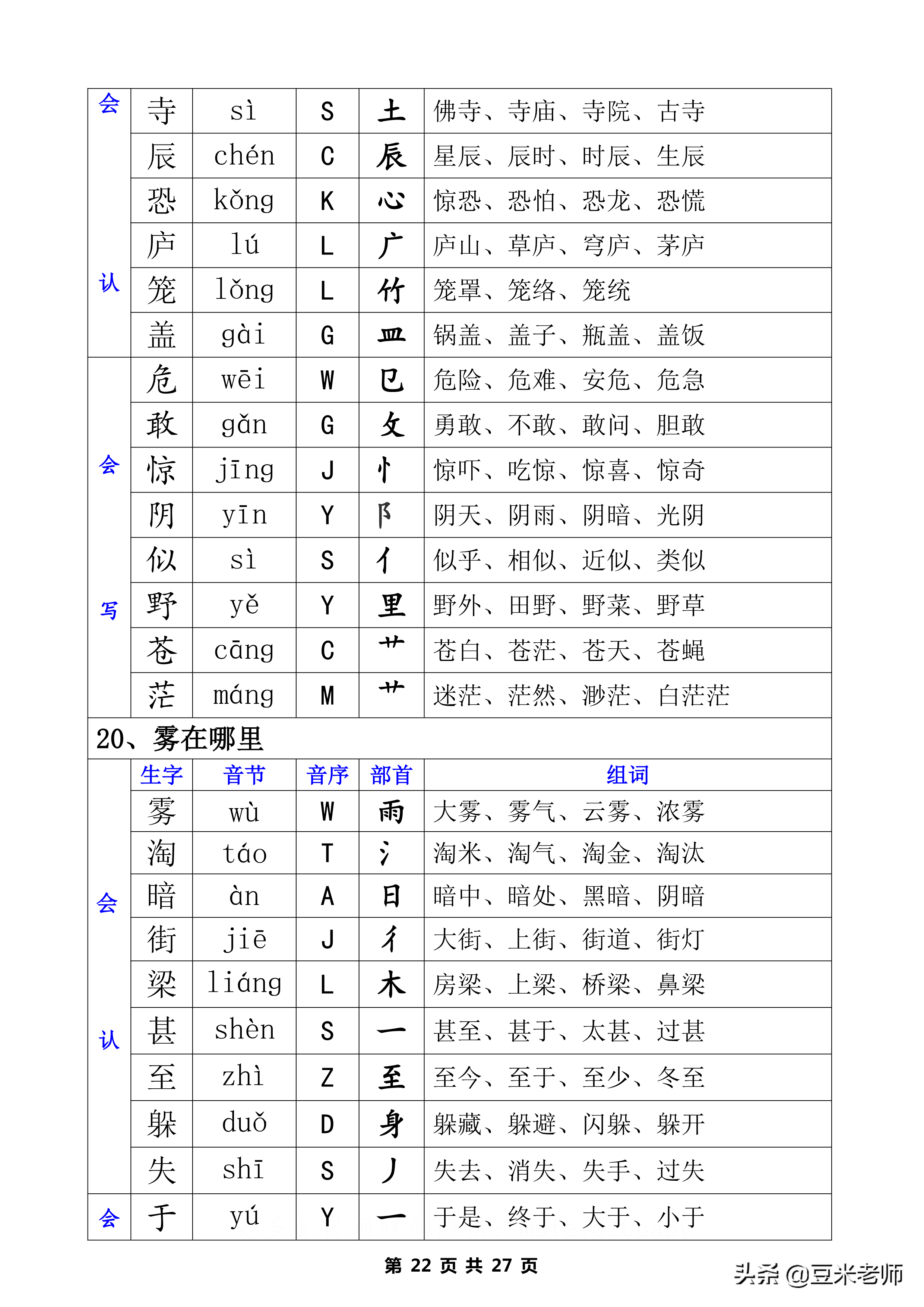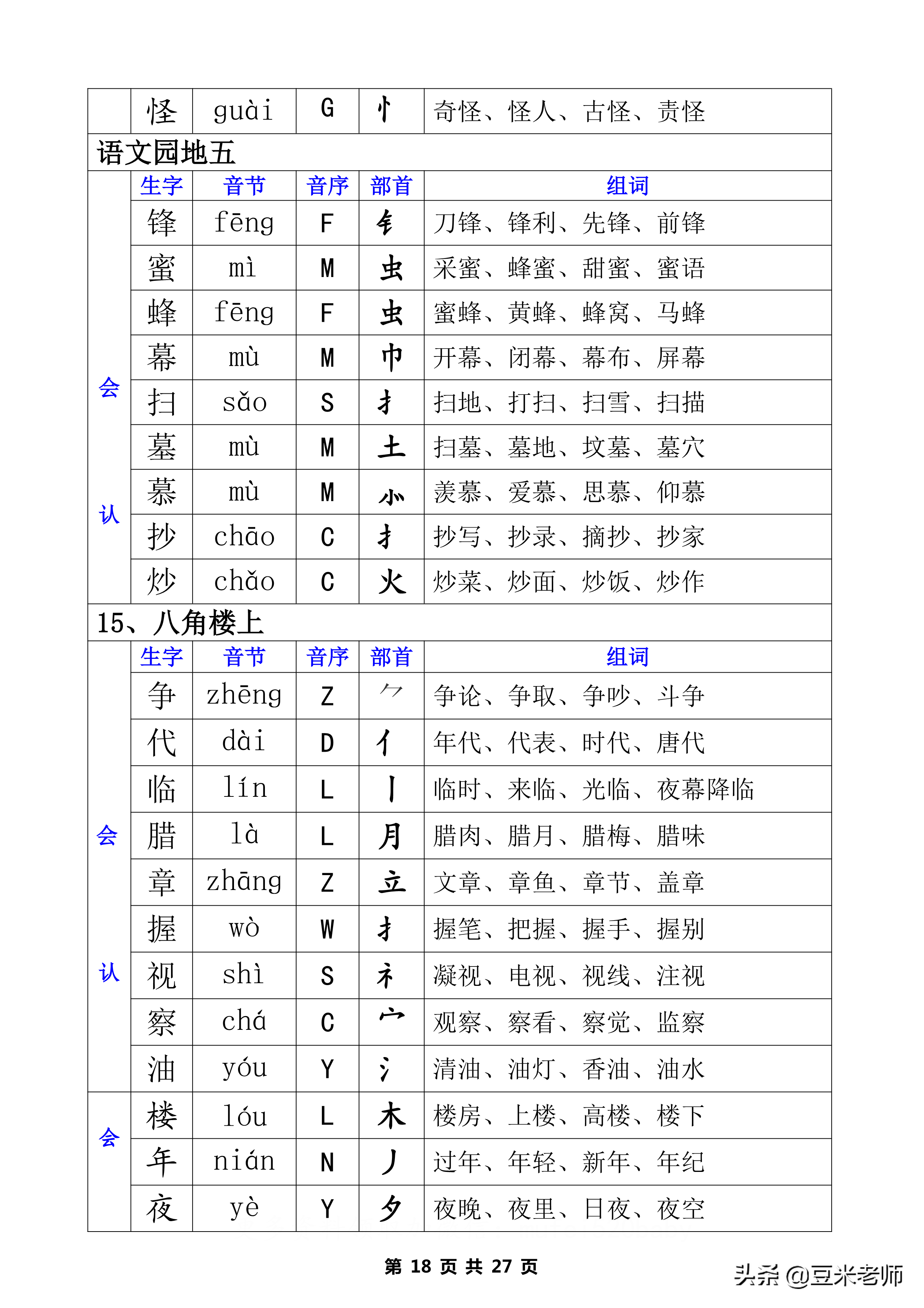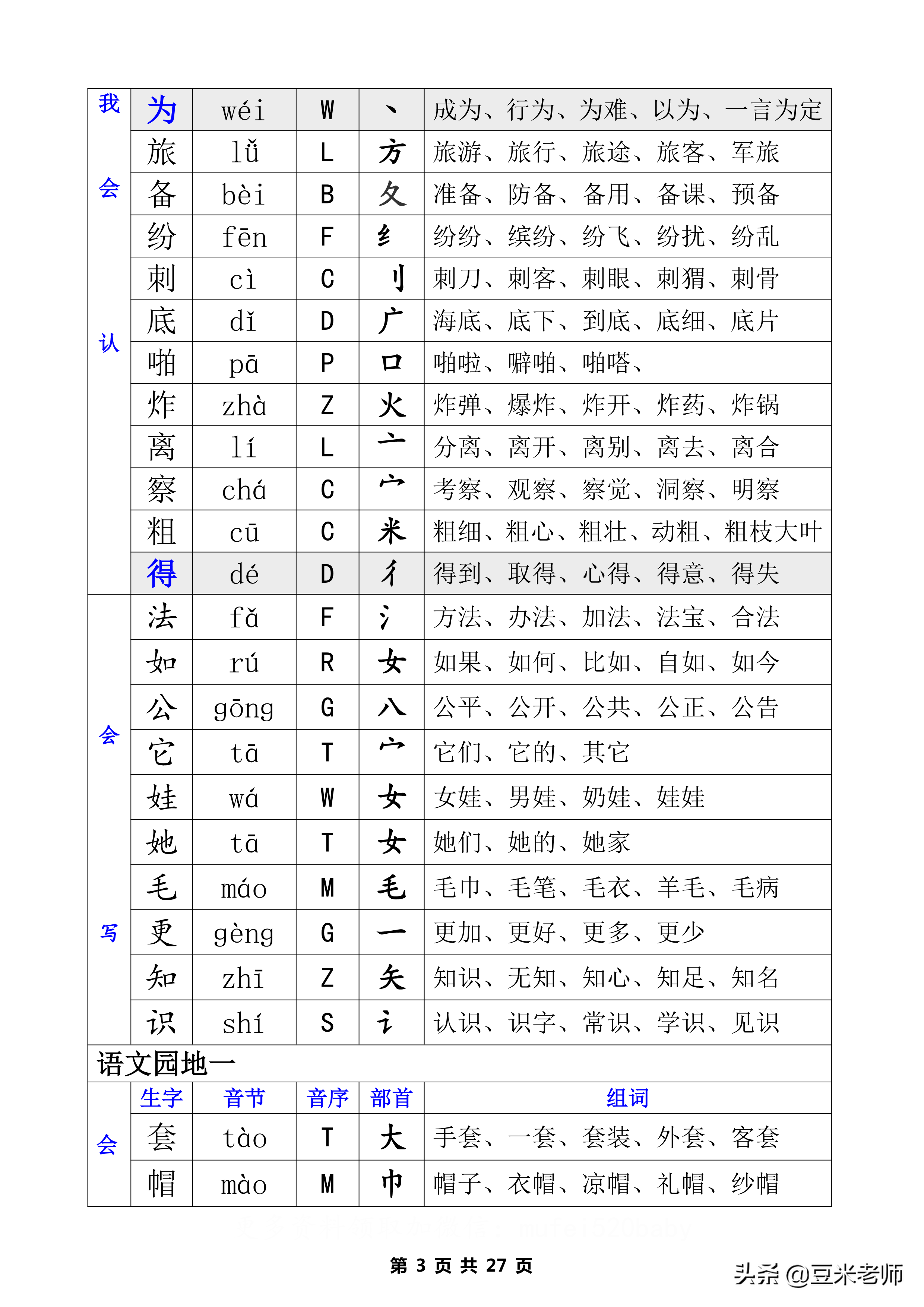 不过,小编在网上搜集了一份去年的生字总结表,包含一类生字和二类生字的音节、音序、部首和组词,也是非常不错的一份资料,可以分享给大家,以供参考。
