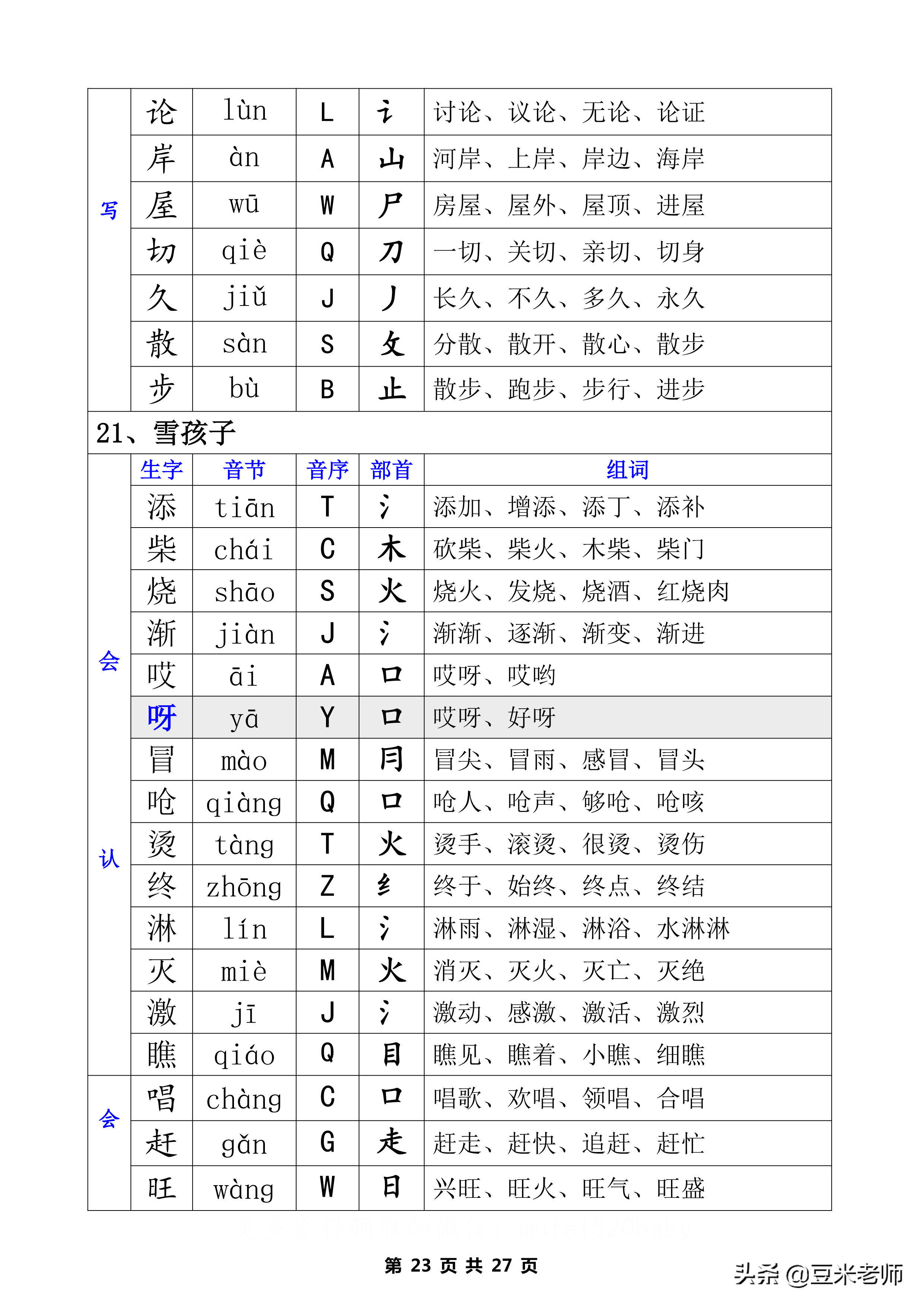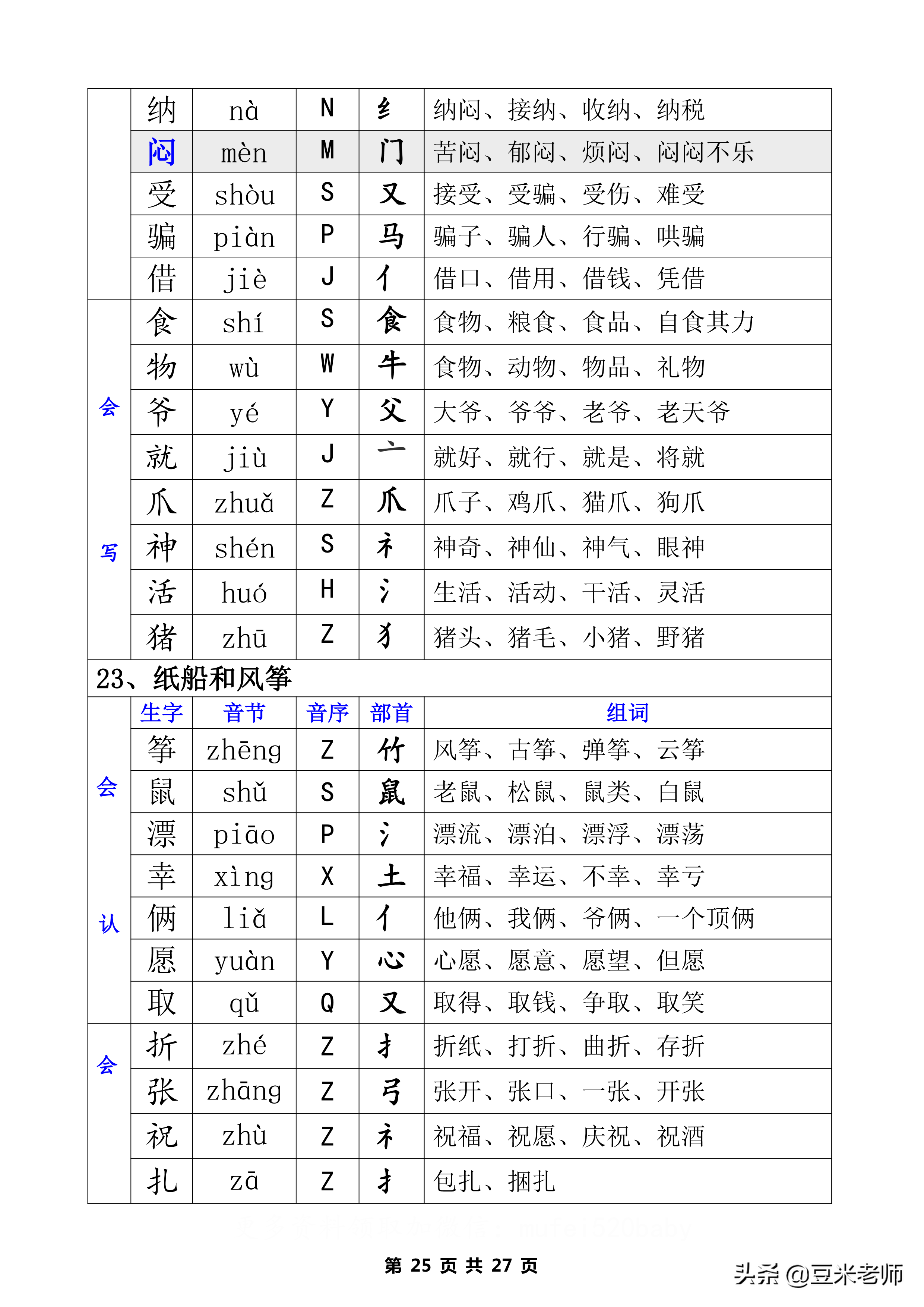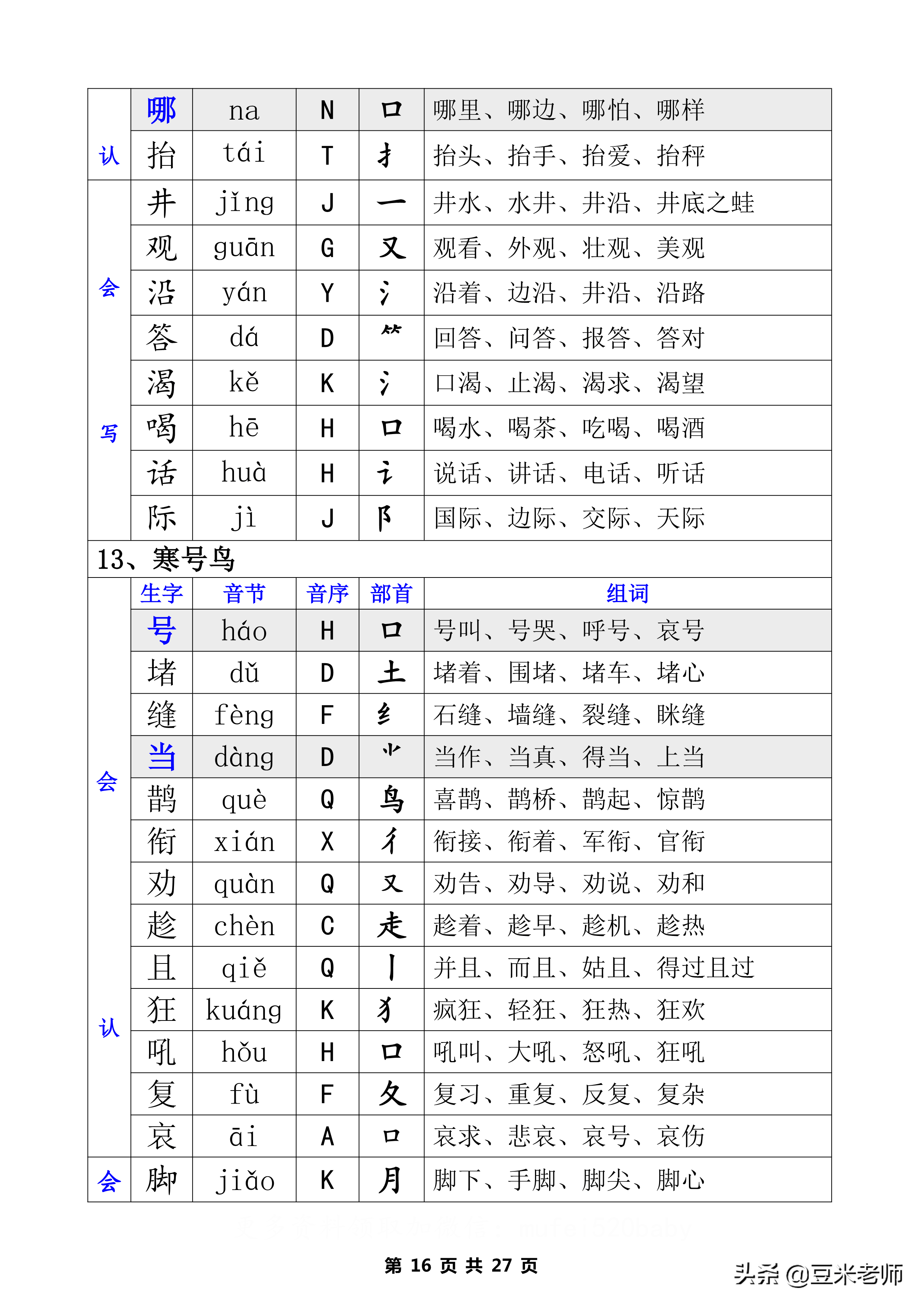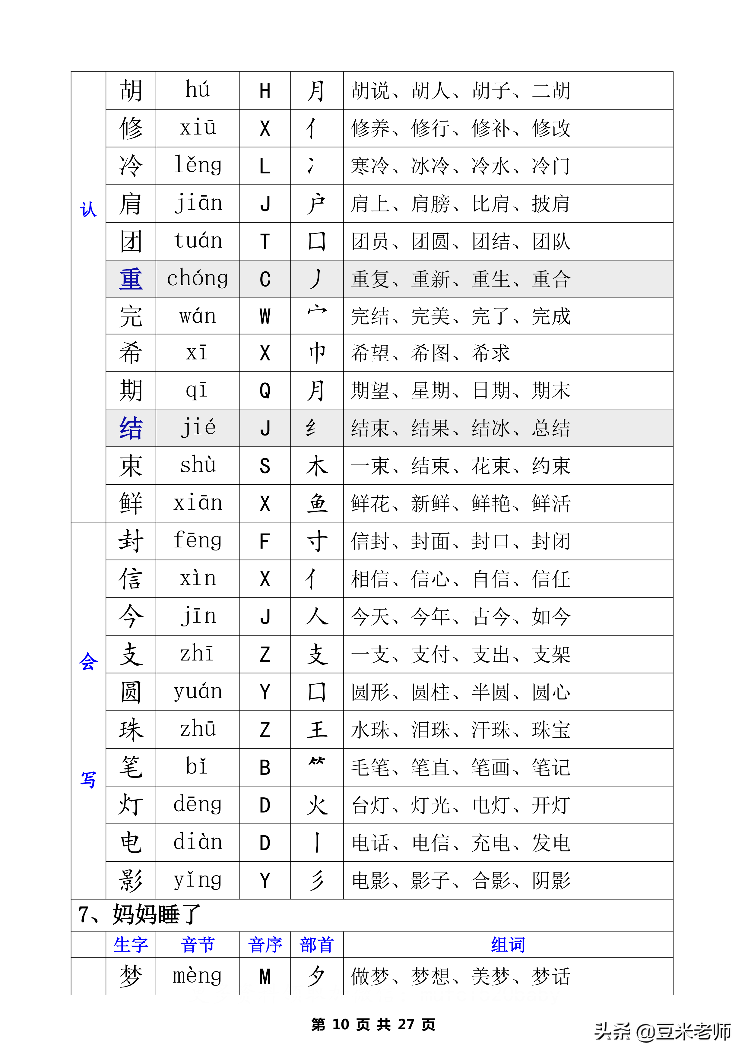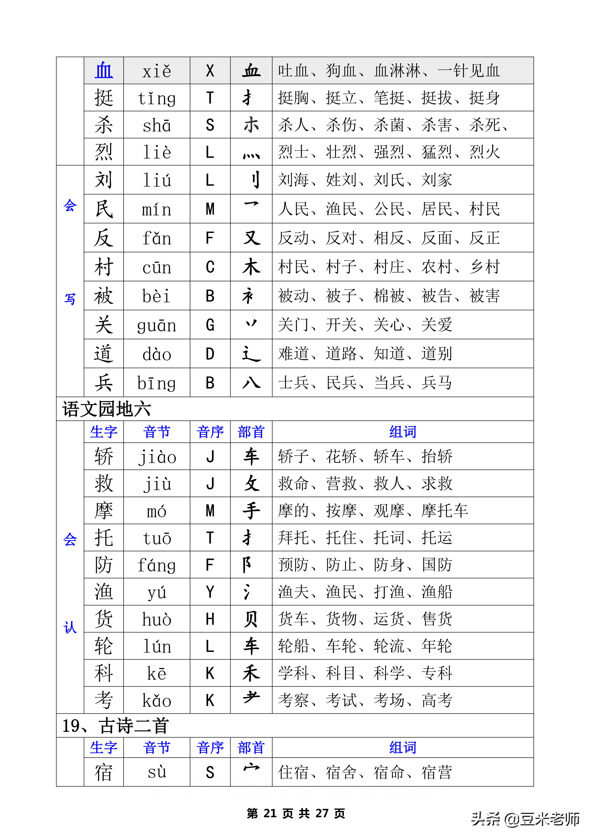 不过,小编在网上搜集了一份去年的生字总结表,包含一类生字和二类生字的音节、音序、部首和组词,也是非常不错的一份资料,可以分享给大家,以供参考。