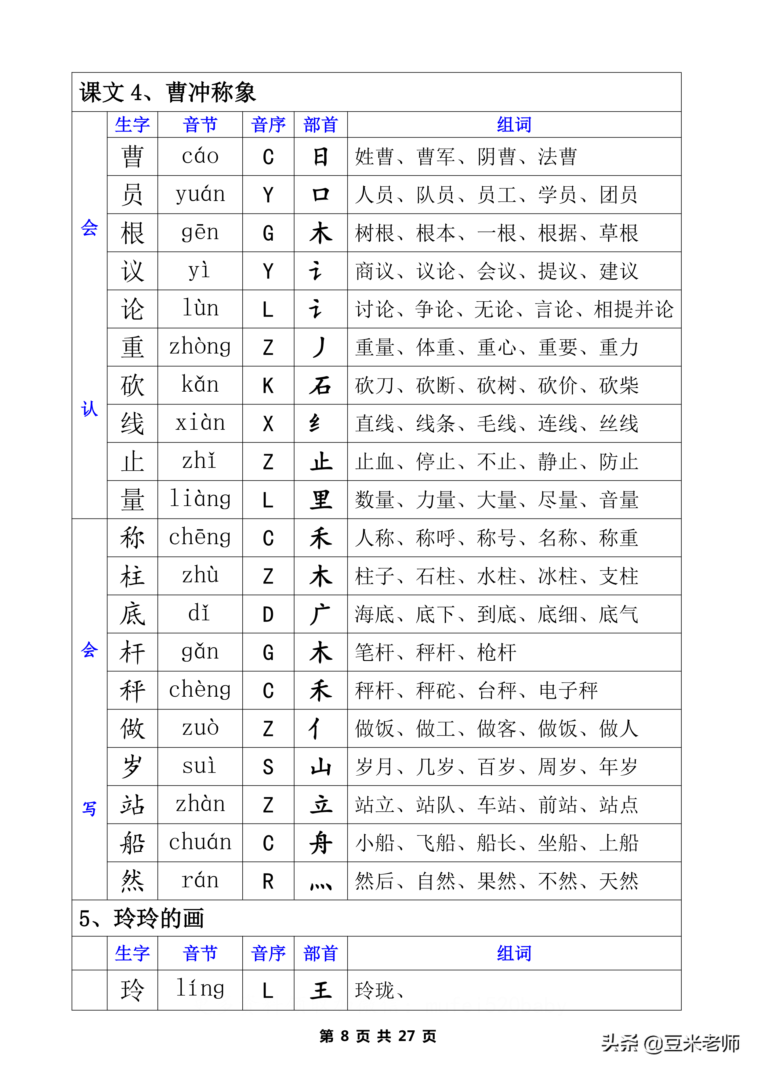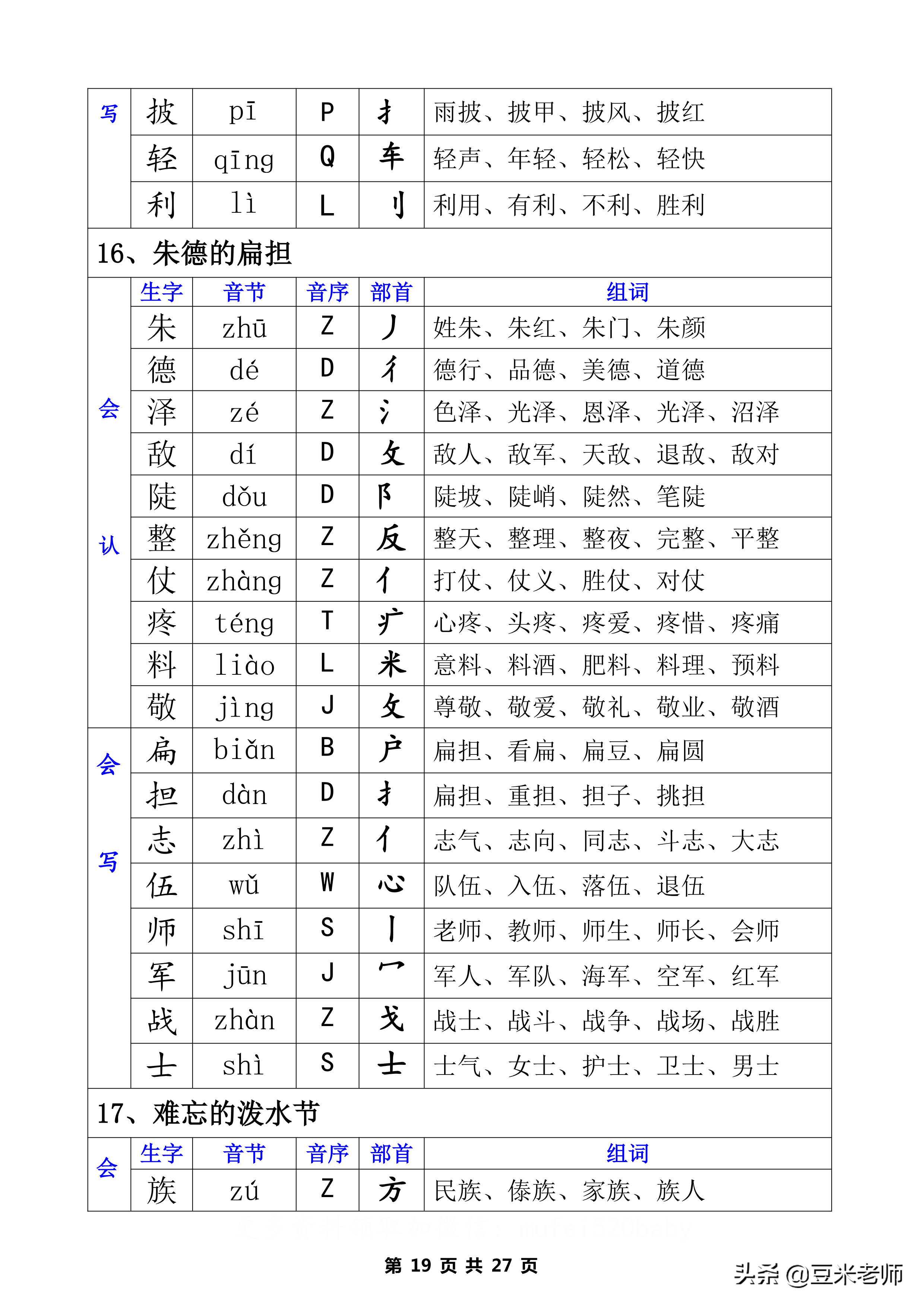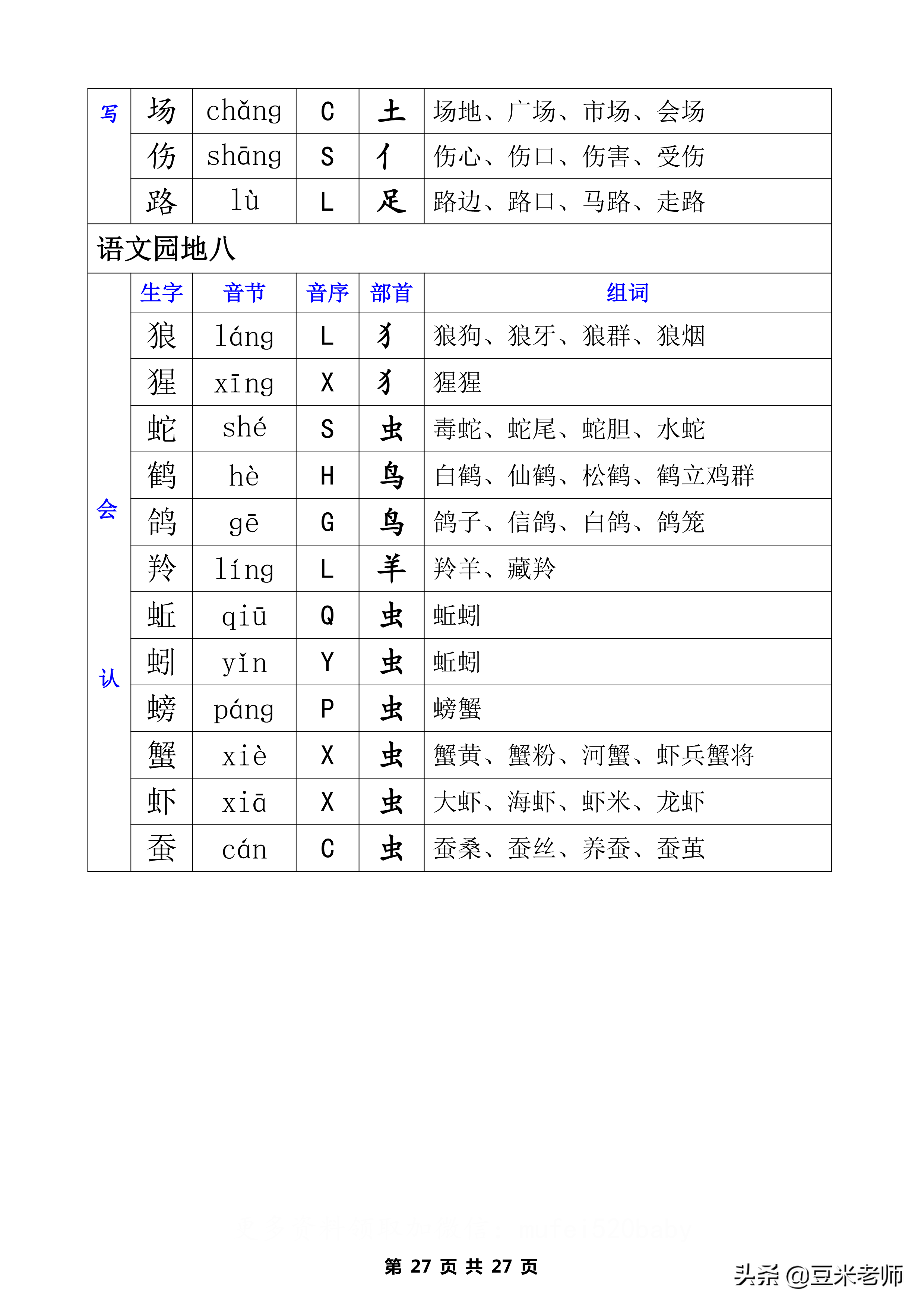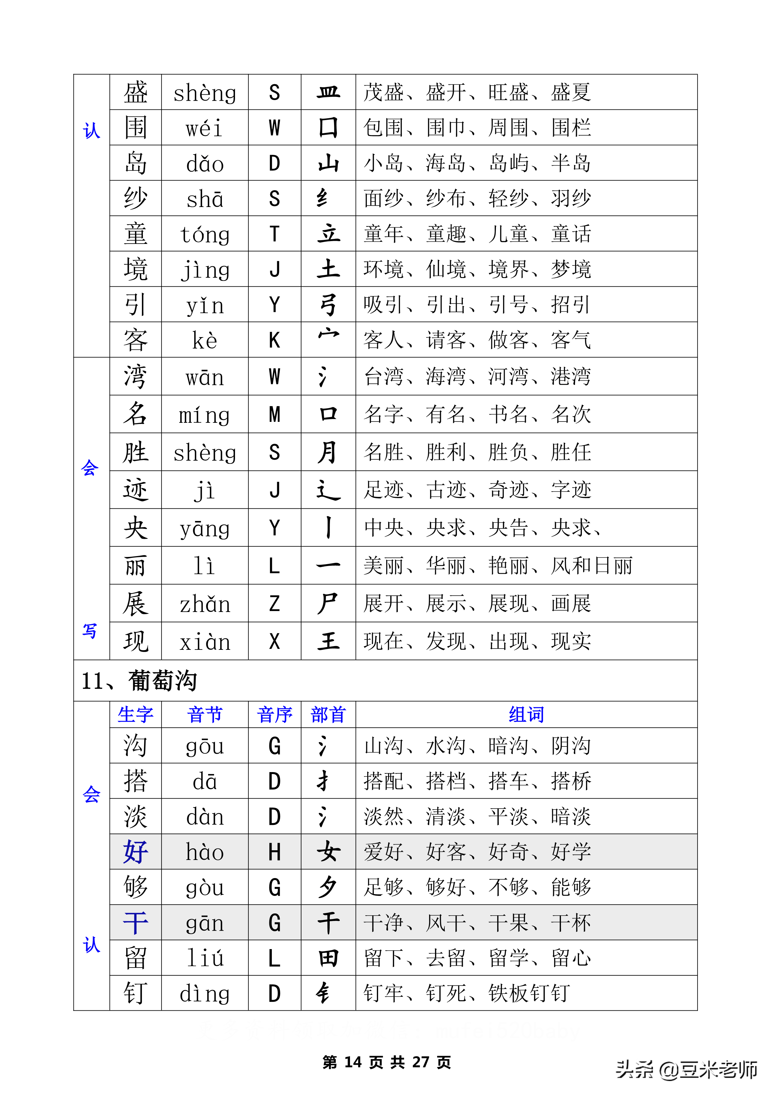 不过,小编在网上搜集了一份去年的生字总结表,包含一类生字和二类生字的音节、音序、部首和组词,也是非常不错的一份资料,可以分享给大家,以供参考。