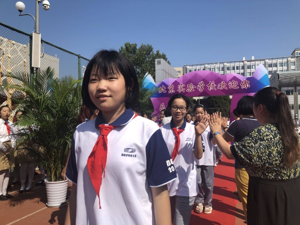 北京实验学校学生与老师们击掌迎接新学期。
