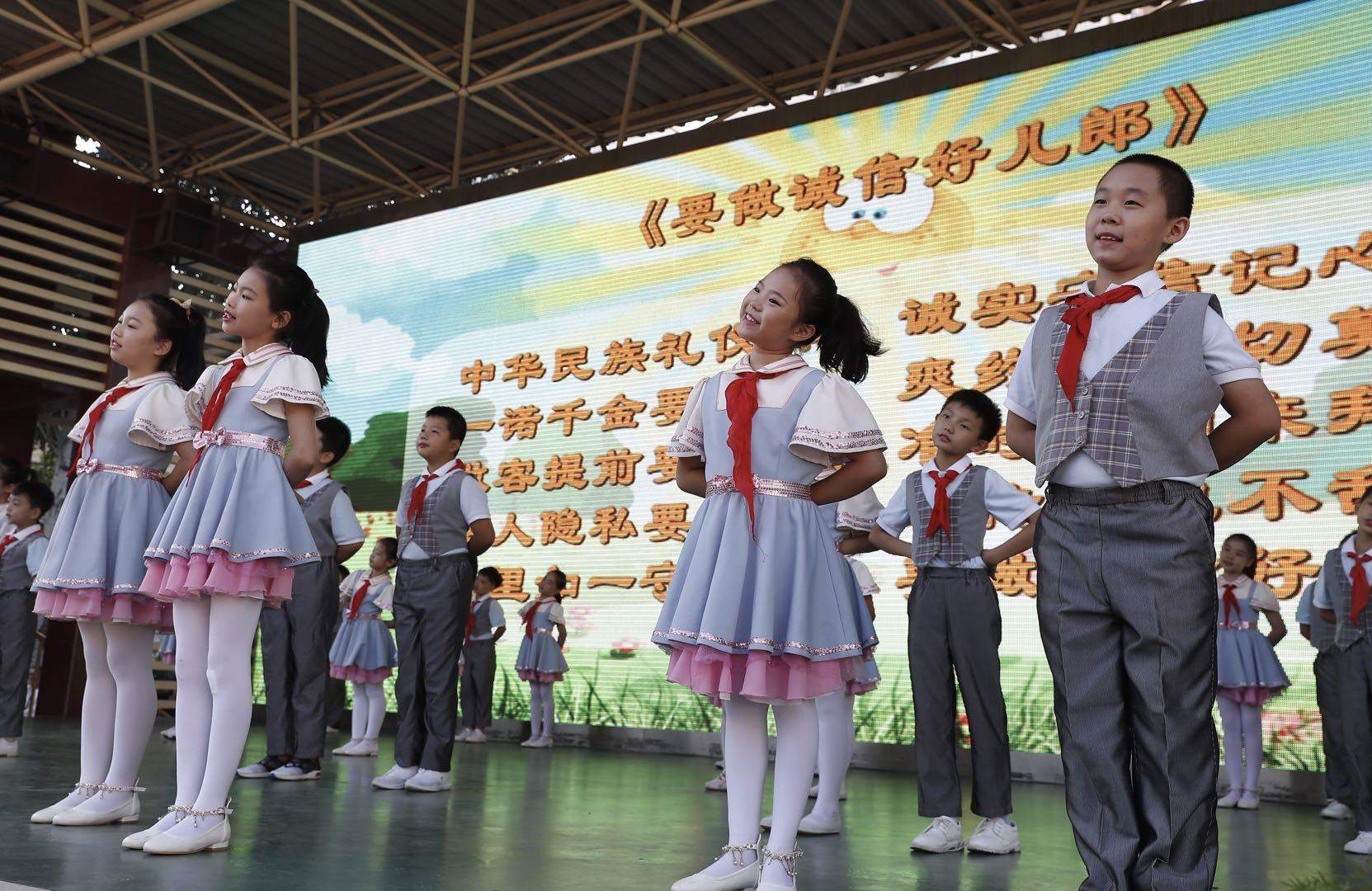 新京报讯(记者 方怡君)“问路前,说请问,请人帮忙说费心。去请人,先敲门,听到请时再进门。”9月1日,北京市多所中小学陆续开学。北京市海淀区实验小学在一首由学生、老师共同编写的日常行为规范童谣中,开启开学第一课。
