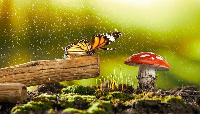 蝴蝶身体非常轻盈,下暴雨时,对于体重只有500毫克的大斑蝶来说,是很恐怖的,蝴蝶若是被暴雨中一滴70毫克重的雨点击中,犹如两个小保龄球一样重的水球打在人身上,很危险。因此每当乌云密布天色晦暗时,蝴蝶就会在栖息地寻找躲雨的地方,但如果躲避不及,被雨水淋湿,其实也不会怎样,因为蝴蝶的翅膀是由几百片细小的鳞片组成的,和鱼身上的鳞片相似,下雨时还能遮挡雨水,使它们不会被真的被淋湿。