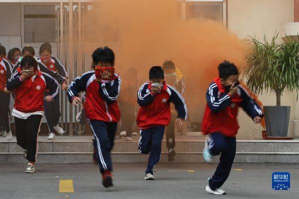 11月9日,山东省滕州市红荷路实验小学学生在进行“火灾”逃生演练。