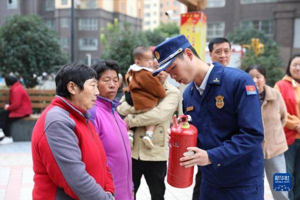 11月9日,在江苏省淮安市洪泽区高良涧街道润园小区,消防员为居民讲解灭火器知识。