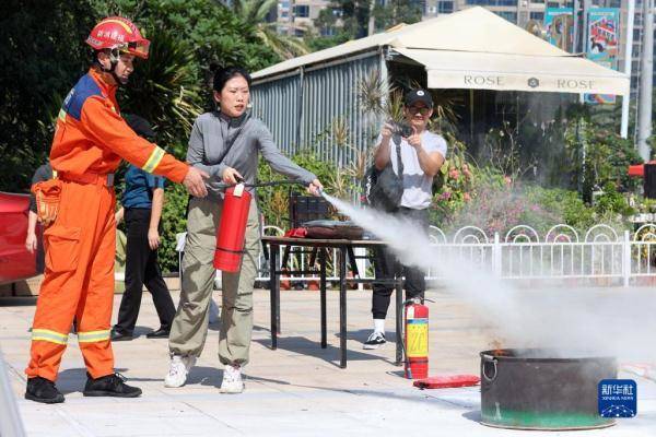 11月9日,在福建省厦门市湖里区,市民在消防员的指导下体验使用灭火器。