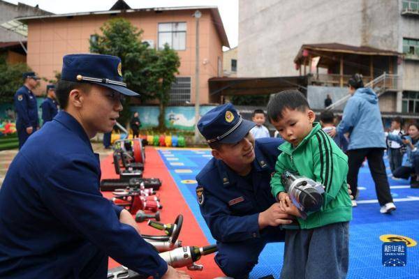 11月9日,在贵州省遵义市余庆县白泥镇下里幼儿园,小朋友体验使用消防救援器材。