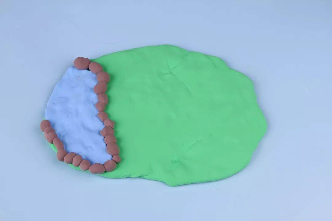5、把压扁后的蓝色粘土贴在绿色草地的边缘,做湖泊。拼在一起的灰色粘土做湖泊的围边。