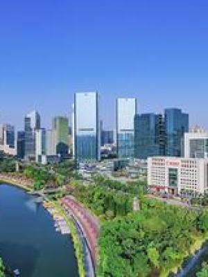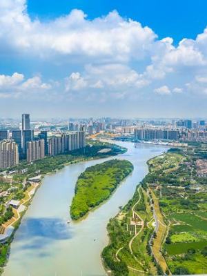 文华公园上空蓝天白云,周边绿化茂盛,高楼大厦,体现了广州禅城现代城市形象,佛山顺德面积。 佛山日报记者 符诗贺 图