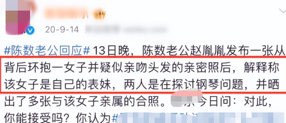然而“渣男”赵胤胤并没有公开澄清,甚至在社交平台上晒出了与陌生女子的亲密照。在“婚变”舆论的压力下,陈数终于出面了,表示那名女子只是赵胤胤的表妹,并晒出了一家三口的幸福照,表示感情稳定。