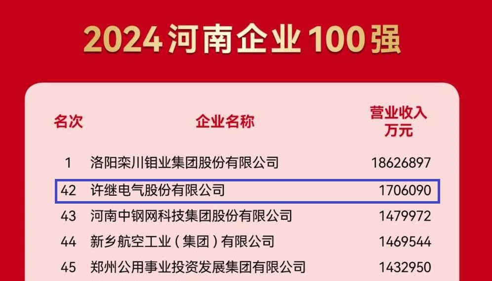 近期,河南省企联发布的“2024河南企业100强”榜单中,许继电气以170.61亿元(2025年)营业收入总额排名全省第42位,也是许昌唯一上榜企业,稳坐许昌企业头把交椅。