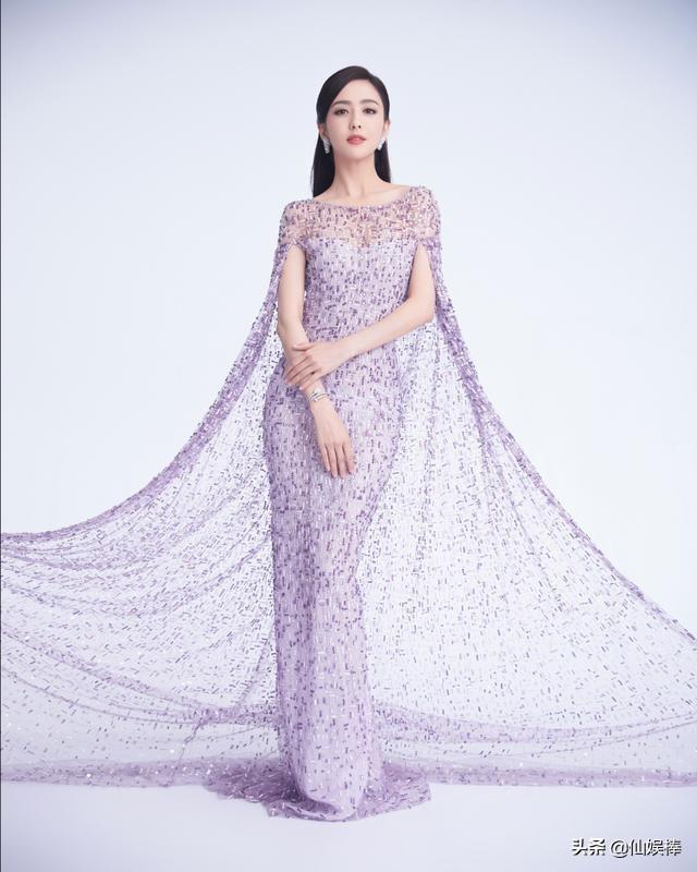 紫色这套有长披肩的设计,远看像纱幔,近看像珠帘,很有天上的七仙女的感觉。