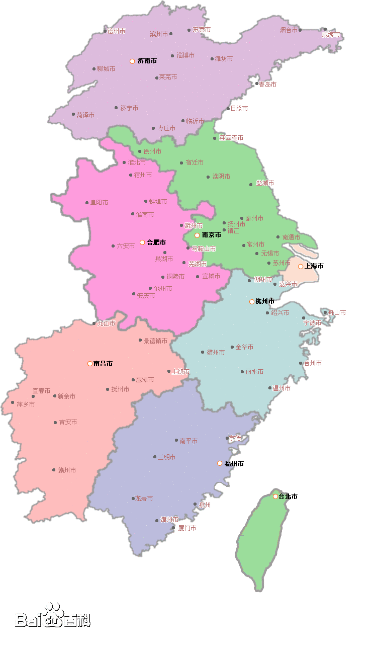 标题说明:华东,位于中国东部,建国初期,华东区曾为中国六大行政区之一,如今华东仍被用作地区用名,包含上海、江苏、浙江、安徽、福建、江西、山东、台湾,七省一市,台湾因特殊性,不在此次标题华东的范围内,故称“六省一市”。