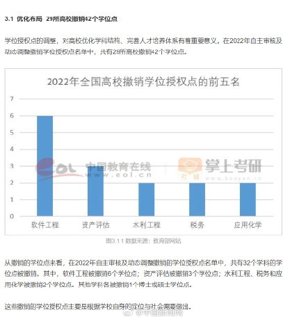 23日,《2024年全国研究生招生调查报告》发布,其中显示:当前研究生培养规模不断扩大,已从“精英化”转向“大众化”阶段,2023年8月28日,备受关注的学位法草案提请审议,草案是学位条例颁布40多年以来相关法律的首次全面修订。草案明确完善学位管理体制,确保学位授予质量。 学位授权点的调整,对高校优化学科结构、完善人才培养体系有着重要意义。在2022年自主审核及动态调整撤销学位授权点名单中,共有29所高校撤销42个学位点。其中,软件工程被撤销6个学位点;资产评估被撤销3个学位点;水利工程、税务和应用化学被撤销2个学位点。其他学科各被撤销1个博士或硕士学位点。
