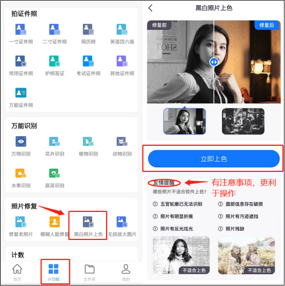 1、首先打开软件,找到小功能页面中的“照片修复”,可以看到有很多选项进行选择,我们选择“黑白照片上色”即可。