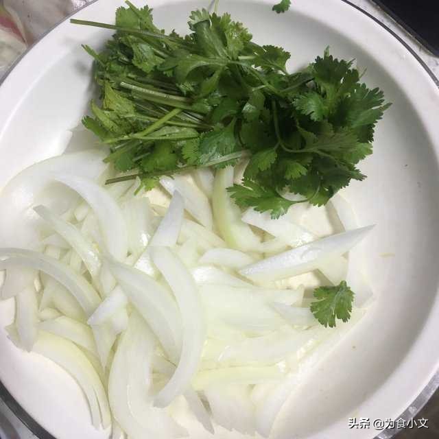 7、炒2分钟后加入圆葱丝,然后加入糖、盐、鸡精、白糖、生抽、老抽、蚝油翻炒均匀