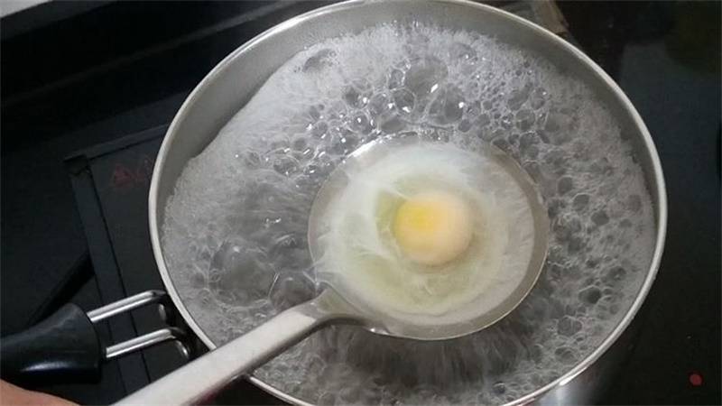 锅内放入适量偏多的清水,用大火烧开;接着把勺子放在开水锅内煮热,然后舀出一勺开水,倒在备好的碗中,水量半碗即可。将洗净鸡蛋的壳磕破,将蛋内的所有蛋液打在盛有热水的碗里,静置两分钟左右。此时将烧水的火慢慢转小,保持锅里的沸水,但不大面积翻滚后,顺势把碗慢慢贴近锅中的热水水面,渐渐倾斜,以让碗中已经变白的蛋液和热水,一同借力滑入锅内。