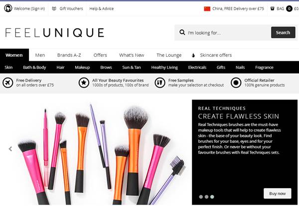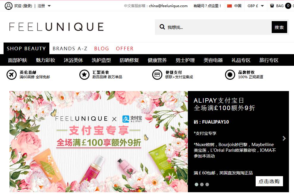 feelunique是欧洲最大的化妆品零售电商,2015开通了全中文网站,页面简洁,购物体验不错。FU不属于THE HUT旗下,所以经常和THE HUT旗下的几家美妆网站叫板比折扣。