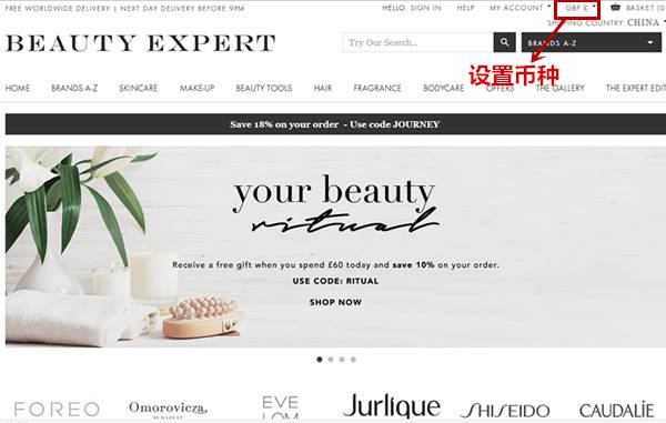 满40英镑全球免邮的,而且折扣力度比较大。注册登录网站后,来到首页,这里设置一下货币种类,比如我是在中国,那就选择CNY(软妹币),默认是英镑。