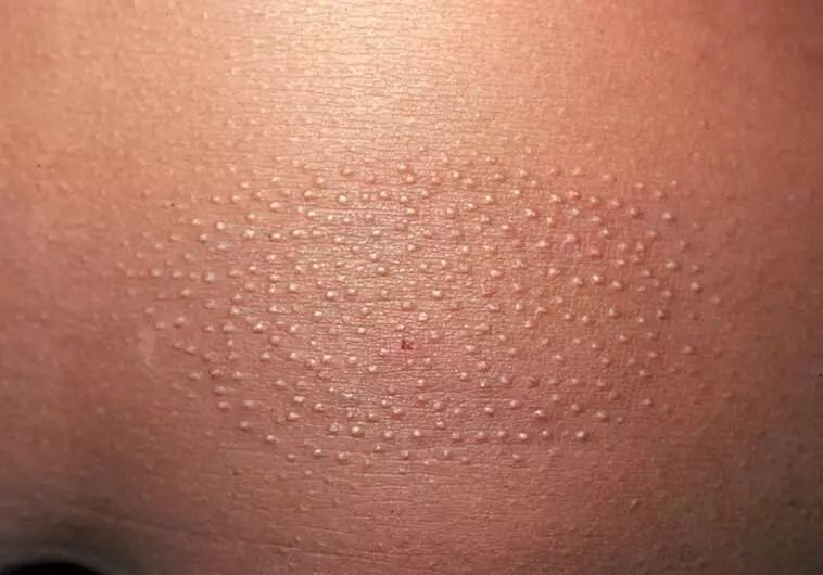 皮肤片状密集皮疹,在颈项、股臀、四肢伸侧等部位出现针尖大小,颜色接近肤色或者灰白色的小疹子,疹子间不融合,密集成片,成圆形、卵圆形或不规则状,皮疹顶部有一根丝状且干燥的突起,拔出丝状突起后出现小的凹陷。