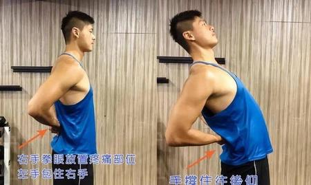 将右手放至腰部最酸痛的部位,接者用左手包住右手