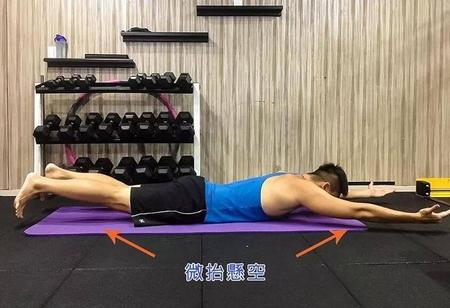 将身体平贴俯卧至地板,并将双手双脚微抬离开地板保持悬空