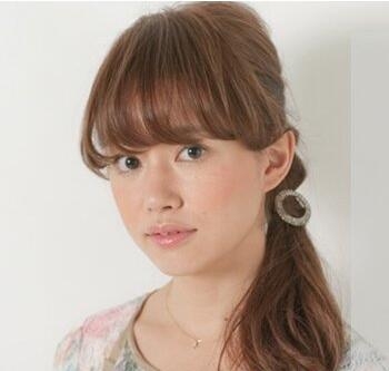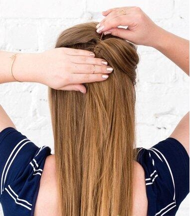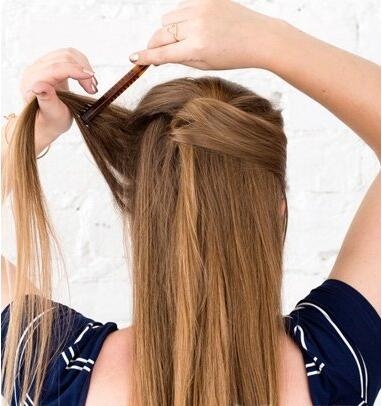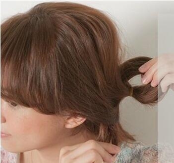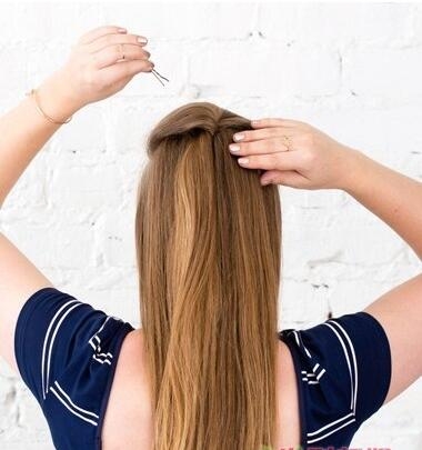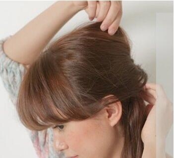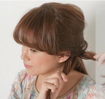 第二步:然后将刘海分离出来,并向后拉,从背部将发丝倒梳打毛,将表面发丝梳理平整,在后面简单的扭转一下,用发卡固定住。